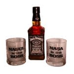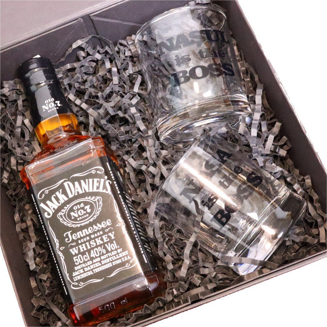 Set Personalizat Cadou Nasi, Whiskey Jack Daniel's cu 2 Pahare, 23x23 cm, Negru, DCNS013