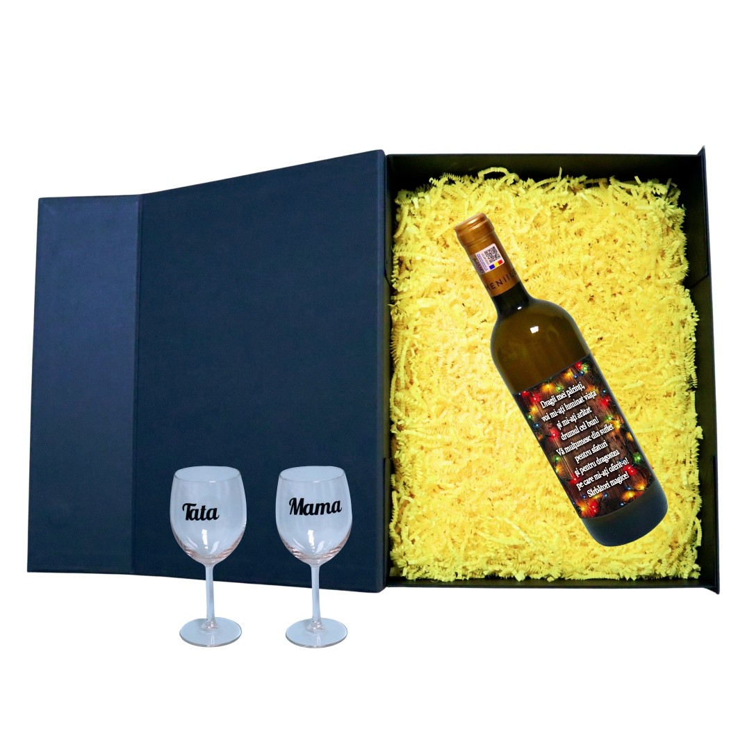 Set cadou Parinti, Cutie de vin cu sticla si 2 pahare, 35x25cm, Vin Domeniile Panciu Feteasca Regala, CSVPA011