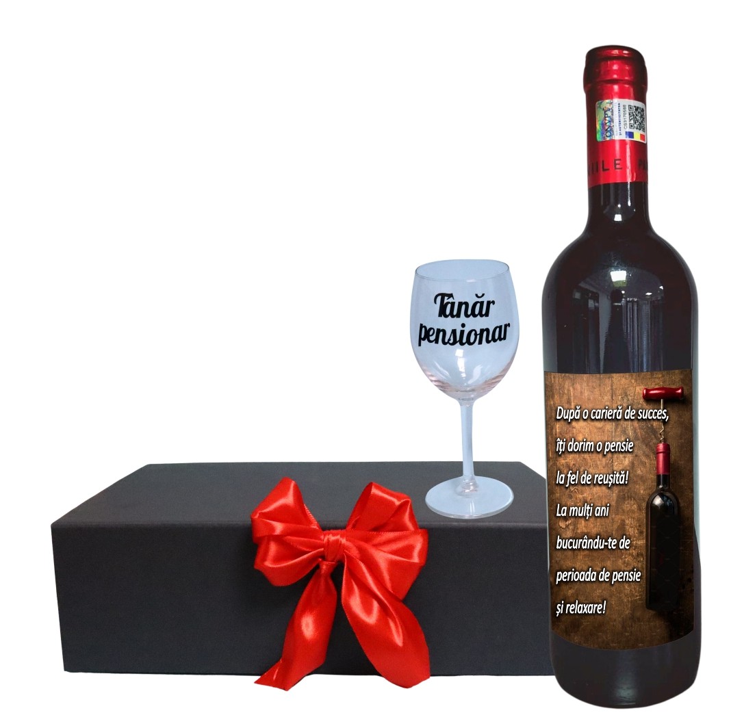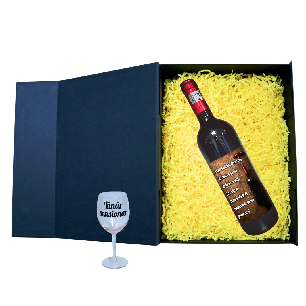 Set cadou Pensionare, Cutie de vin cu sticla si un pahar, 35x25cm, Vin Budureasca Clasic, CSVPN008