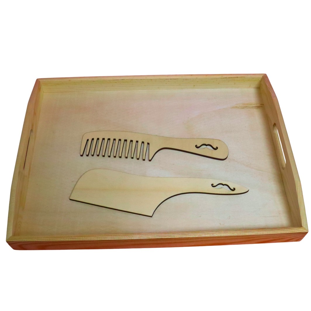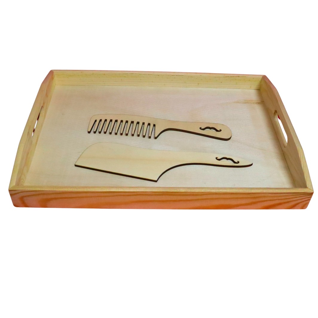 Setul pentru gătitul/ barbieritul mirelui cuprinde tăvița, cutitul(din lemn, cu rol simbolic) și pieptene.
