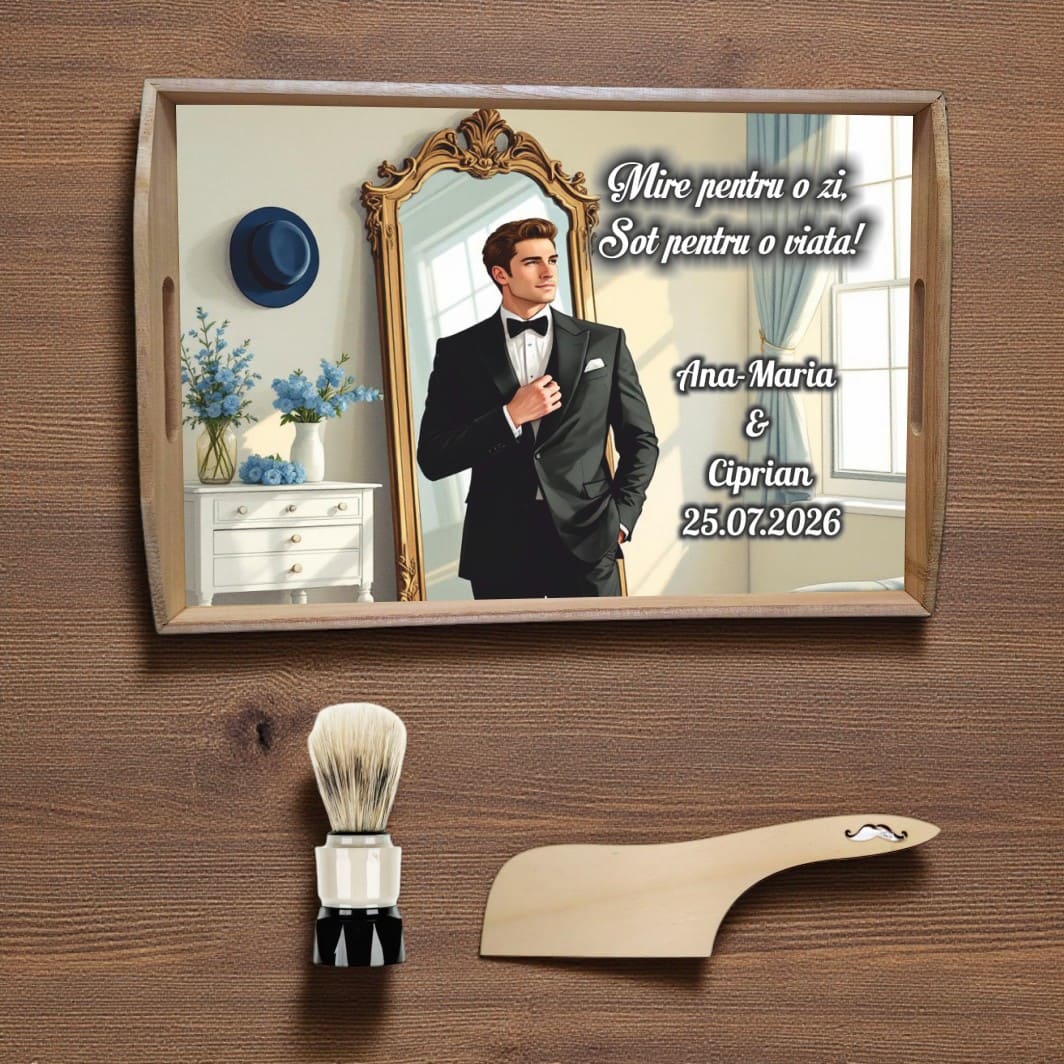 - Tăviță personalizată din lemn – decorată și personalizată cu numele mirilor și data evenimentului, perfectă pentru a așeza accesoriile necesare în timpul pregătirii.