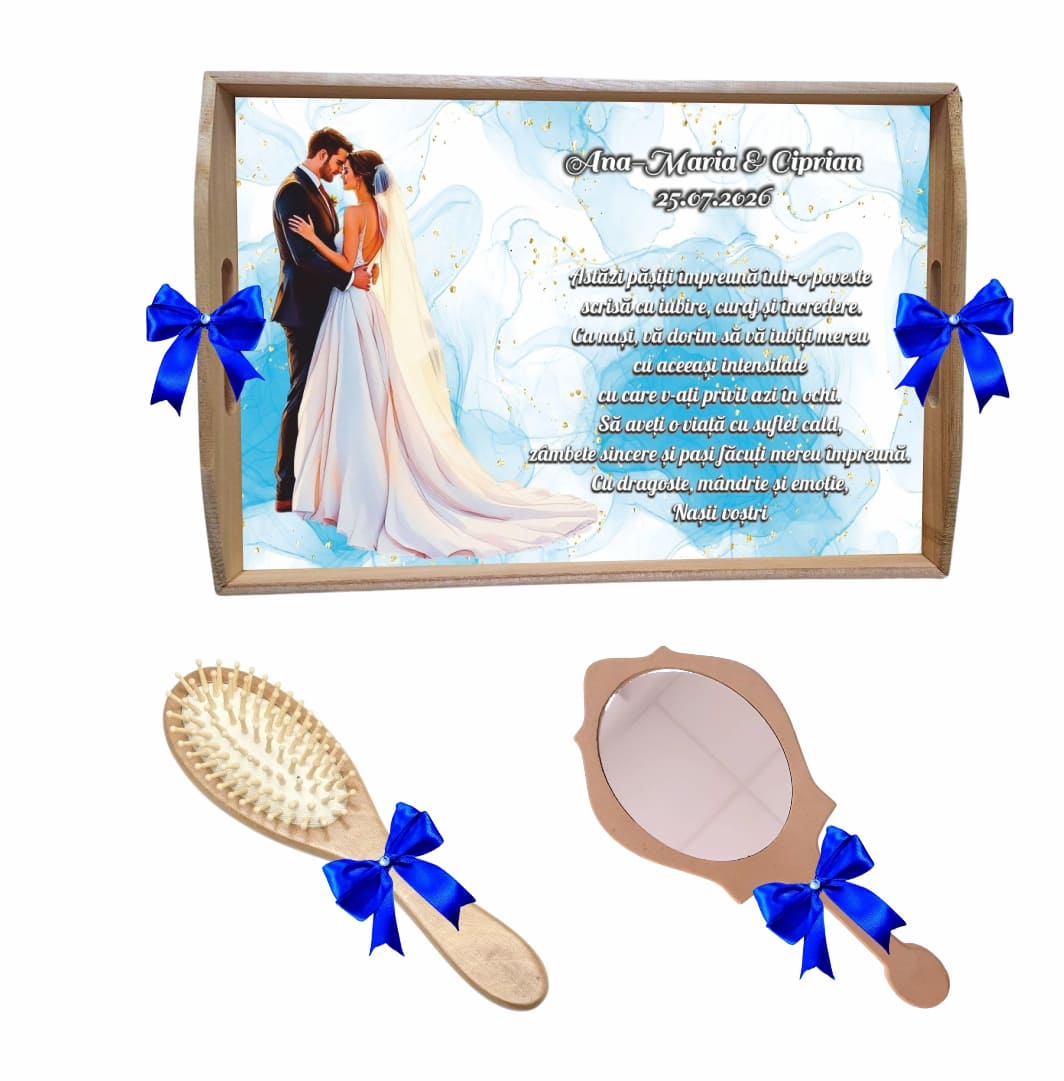 - Tăvița – personalizată cu numele mirilor și data evenimentului. Dimensiunea generoasă de 38 x 28 cm (L x l) o face ideală pentru a expune celelalte accesorii și pentru a fi manevrată cu ușurință în timpul tradiției. Poate fi decorată suplimentar cu flori naturale, voaluri sau panglici, pentru un plus de stil.