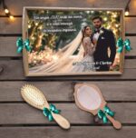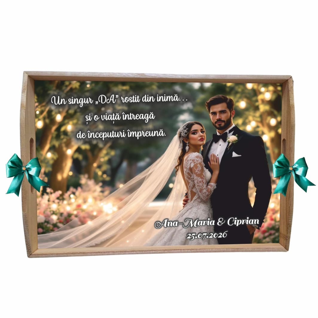 - Tăvița – personalizată cu numele mirilor și data evenimentului. Dimensiunea generoasă de 38 x 28 cm (L x l) o face ideală pentru a expune celelalte accesorii și pentru a fi manevrată cu ușurință în timpul tradiției. Poate fi decorată suplimentar cu flori naturale, voaluri sau panglici, pentru un plus de stil.