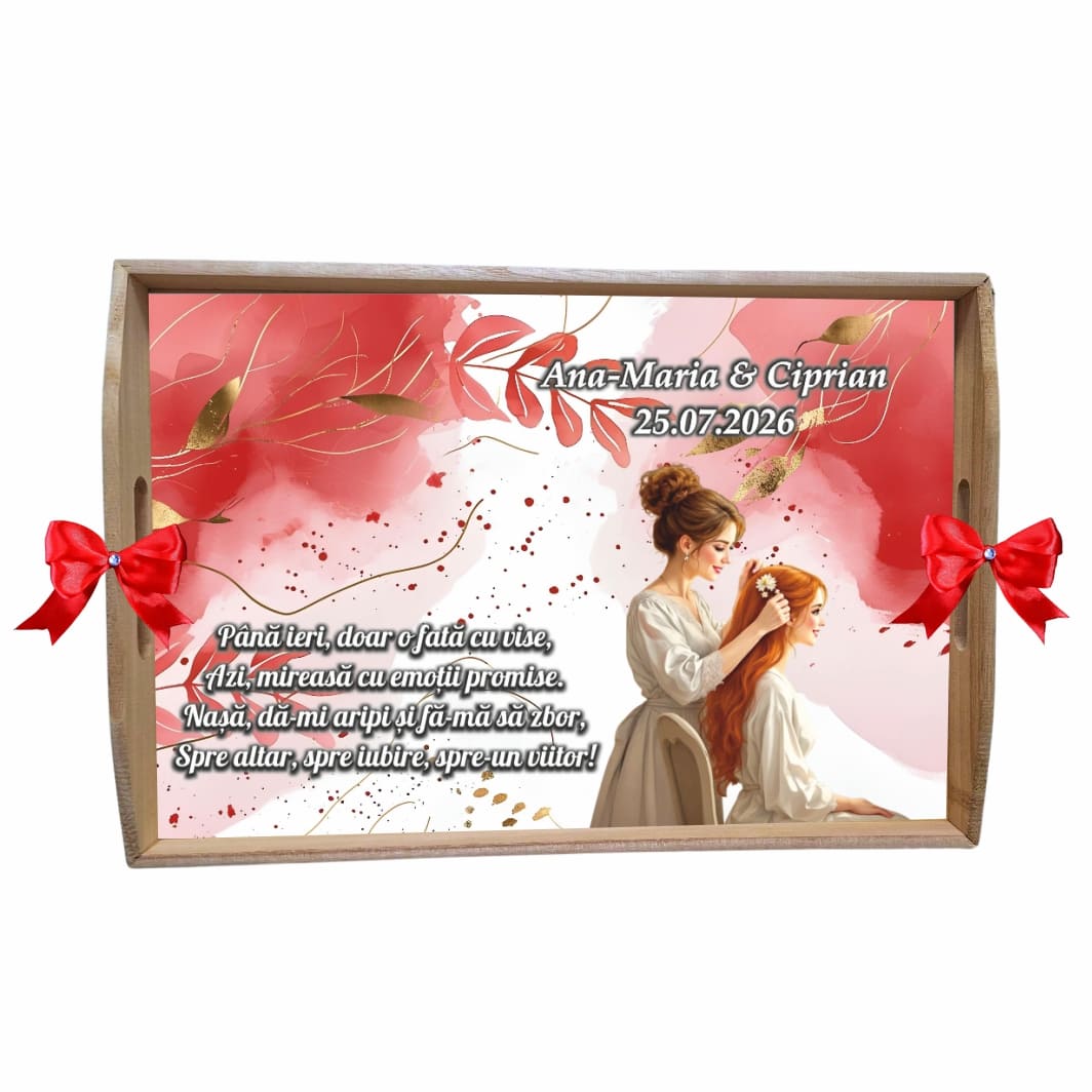 • Tăvița – personalizată cu numele mirilor și data evenimentului. Dimensiunea generoasă de 38 x 28 cm (L x l) o face ideală pentru a expune celelalte accesorii și pentru a fi manevrată cu ușurință în timpul tradiției. Poate fi decorată suplimentar cu flori naturale, voaluri sau panglici, pentru un plus de stil.