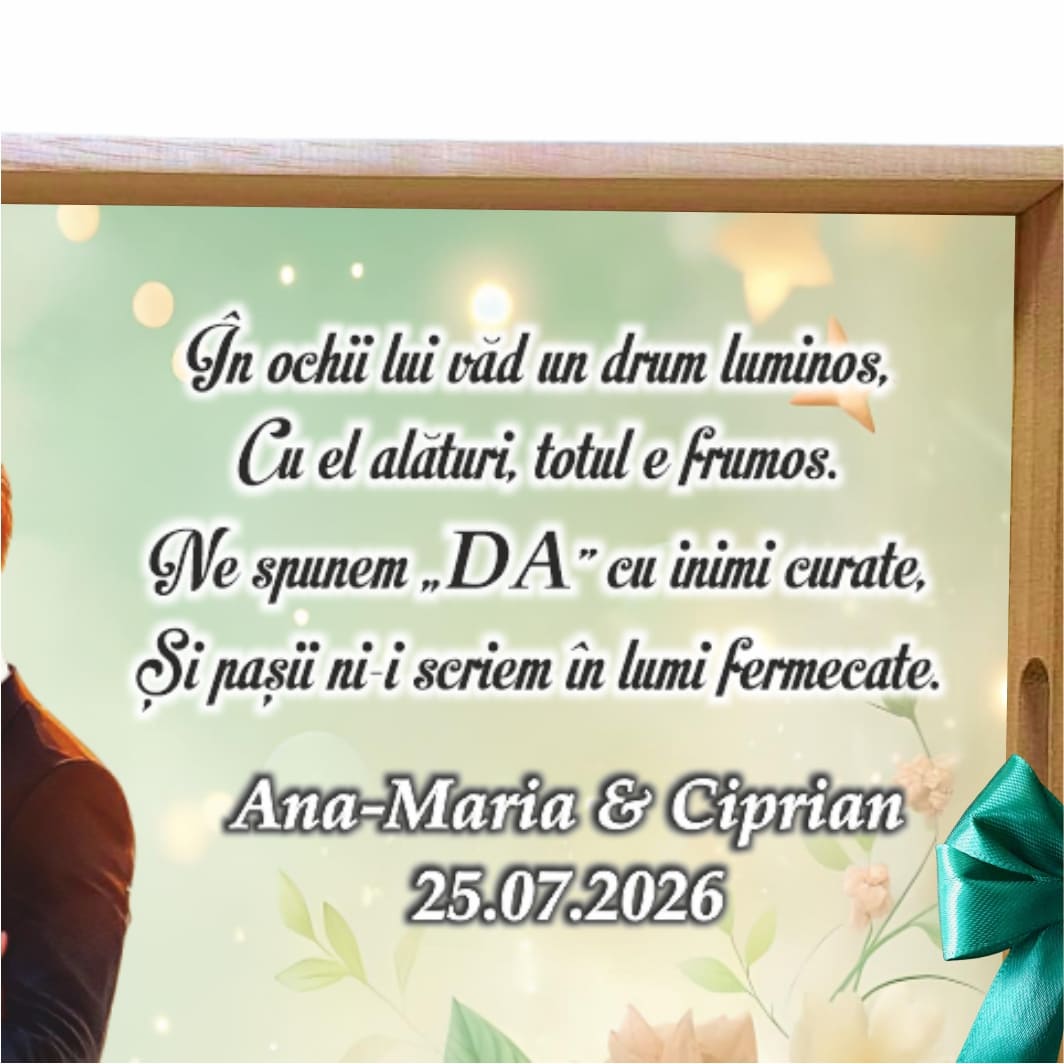 Combinația dintre lemnul natural, fundite verzi și personalizarea delicată transformă produsul într-o piesă cu adevărat memorabilă. După eveniment, setul poate fi păstrat ca element decorativ în casă, amintind cu drag de ziua în care iubirea a fost celebrată în cel mai frumos mod posibil.