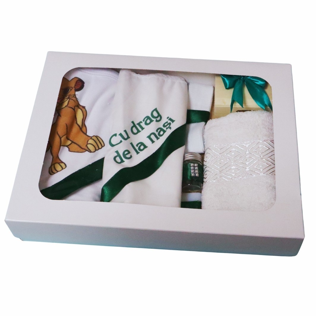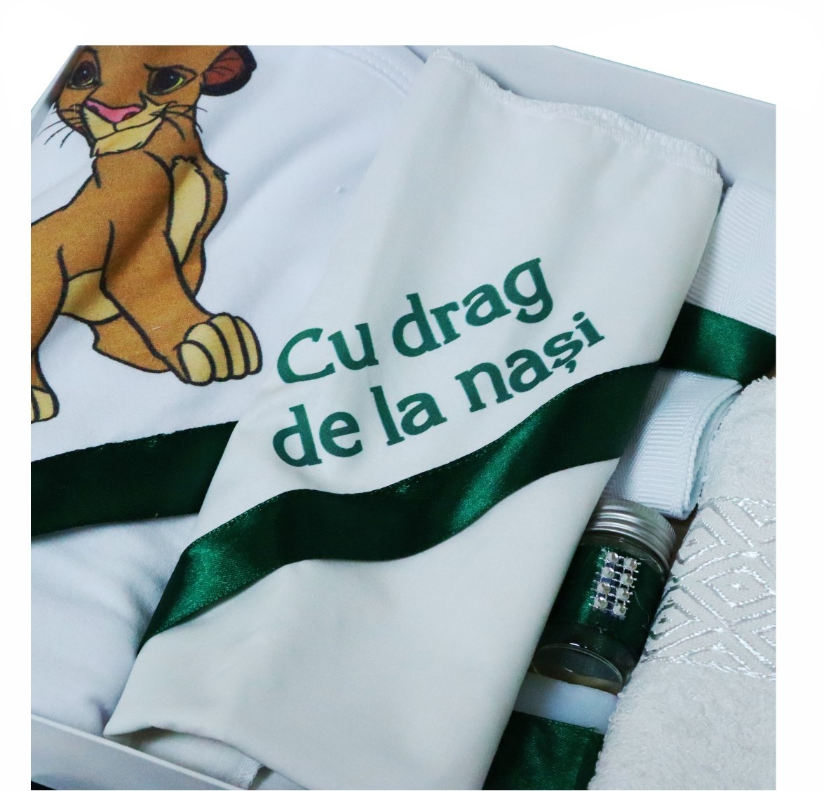 Trusoul cu tematica Lion King si panglica verde, contine tot ce este necesar la biserica, pentru botez si vine ambalat intr-o cutie de cadou.