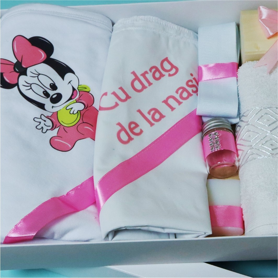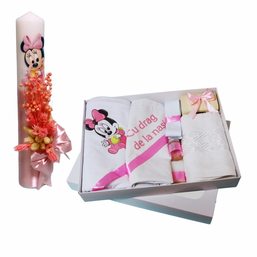 Trusoul cu tematica Minnie Mouse si panglica roz, contine tot ce este necesar la biserica, pentru botez si vine ambalat intr-o cutie de cadou.
