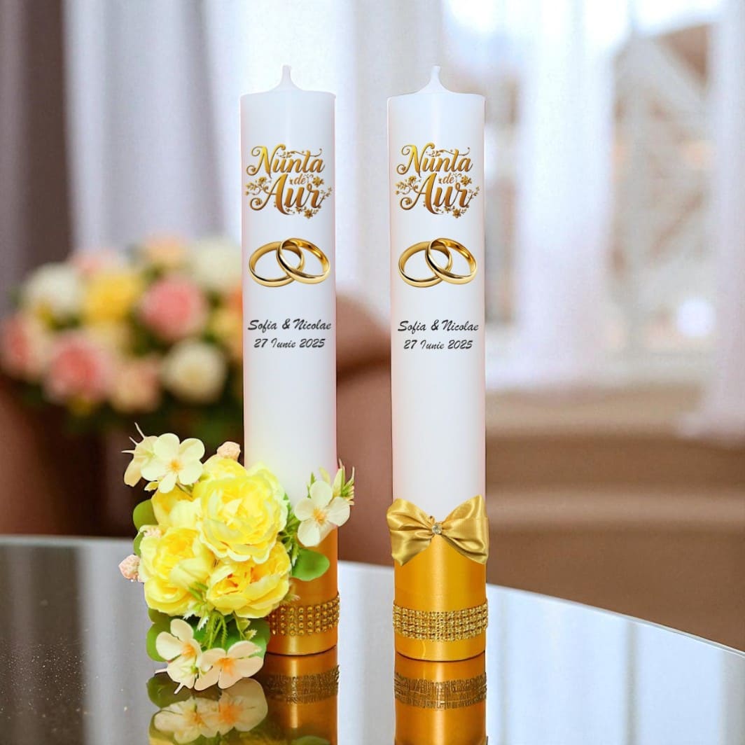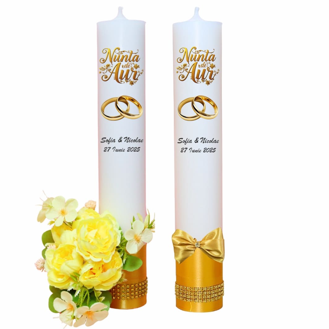 Set doua lumanari pentru nunta de aur, mire si mireasa, cu un design modern, fiind perfecte pentru o nunta ca in povesti.