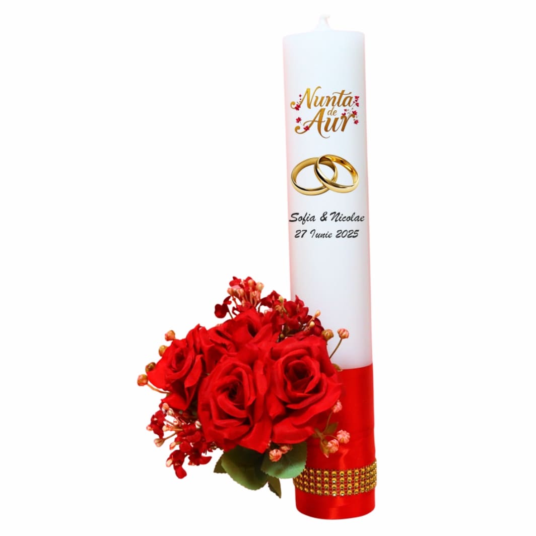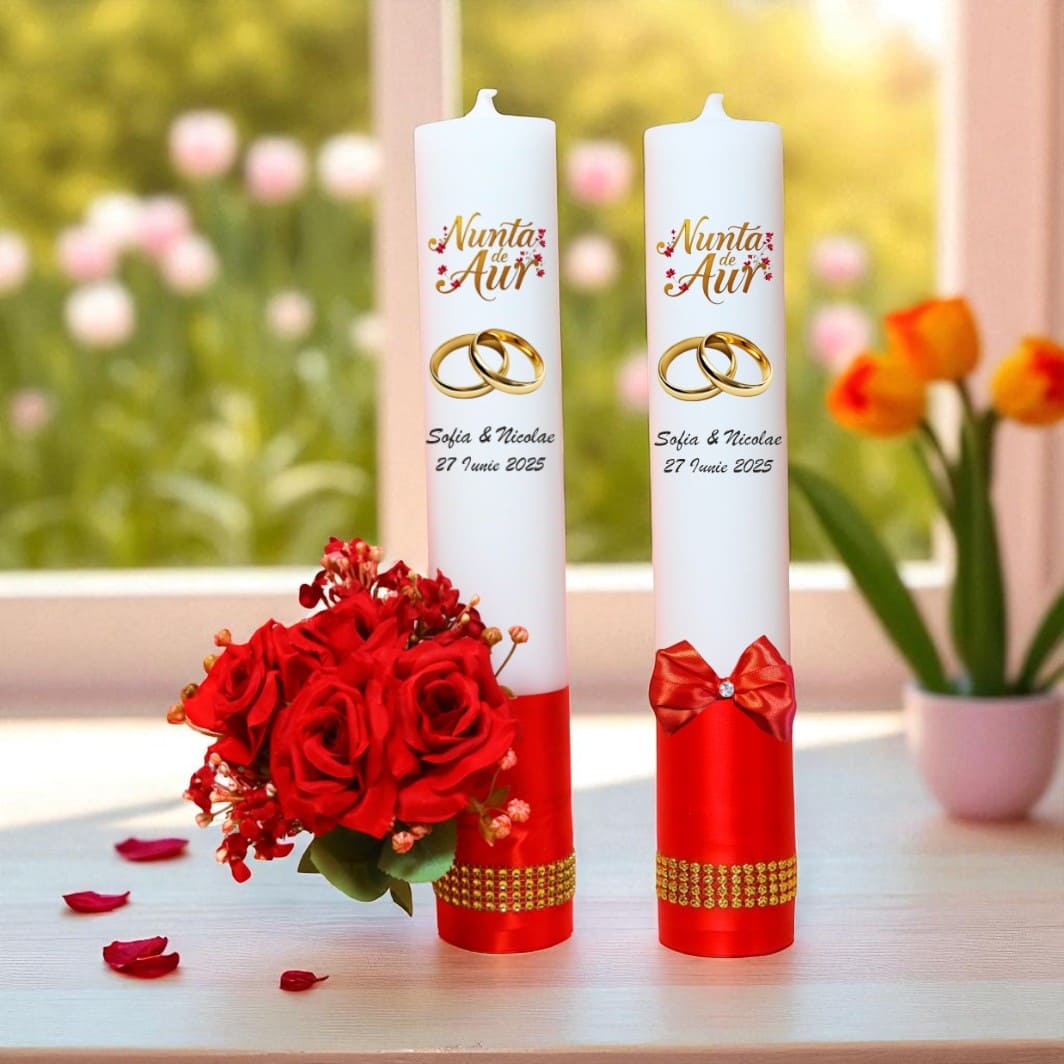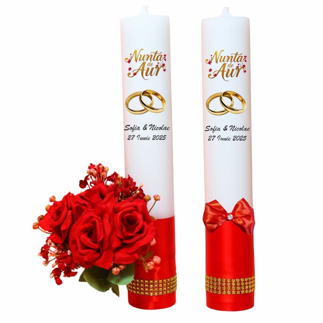 Set Lumanari, Nunta de Aur, Personalizate, 2 Bucati, Rosu, 35 cm, LNAU005