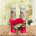 Lumanarile sunt personalizate cu numele mirilor si data evenimentului.
