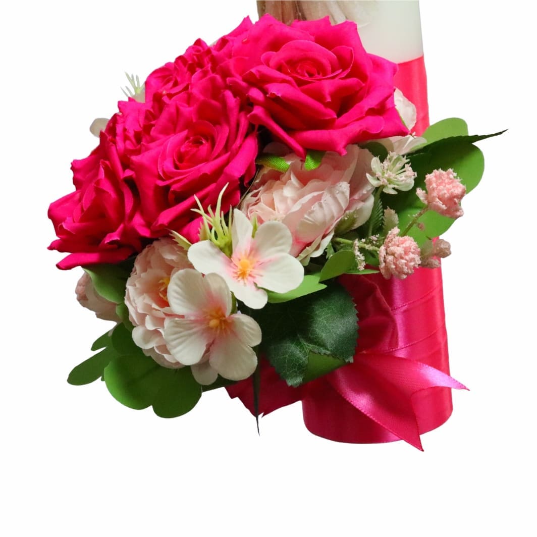 Lumanarea miresei este decorata cu flori artificiale sub forma de buchet.