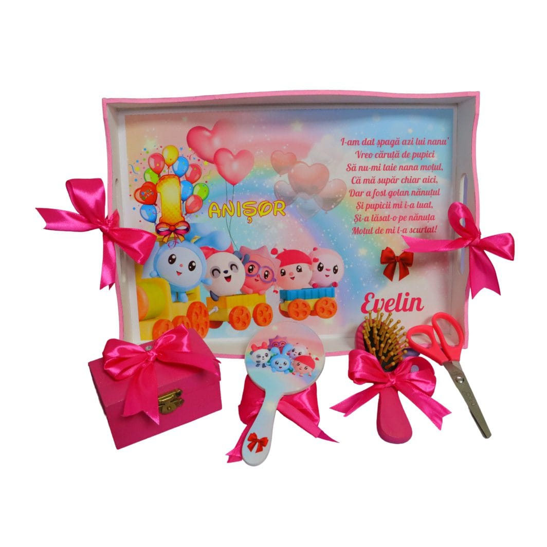 Setul se personalizeaza prin schimbarea numelui copilului, restul textului si grafica este standard.