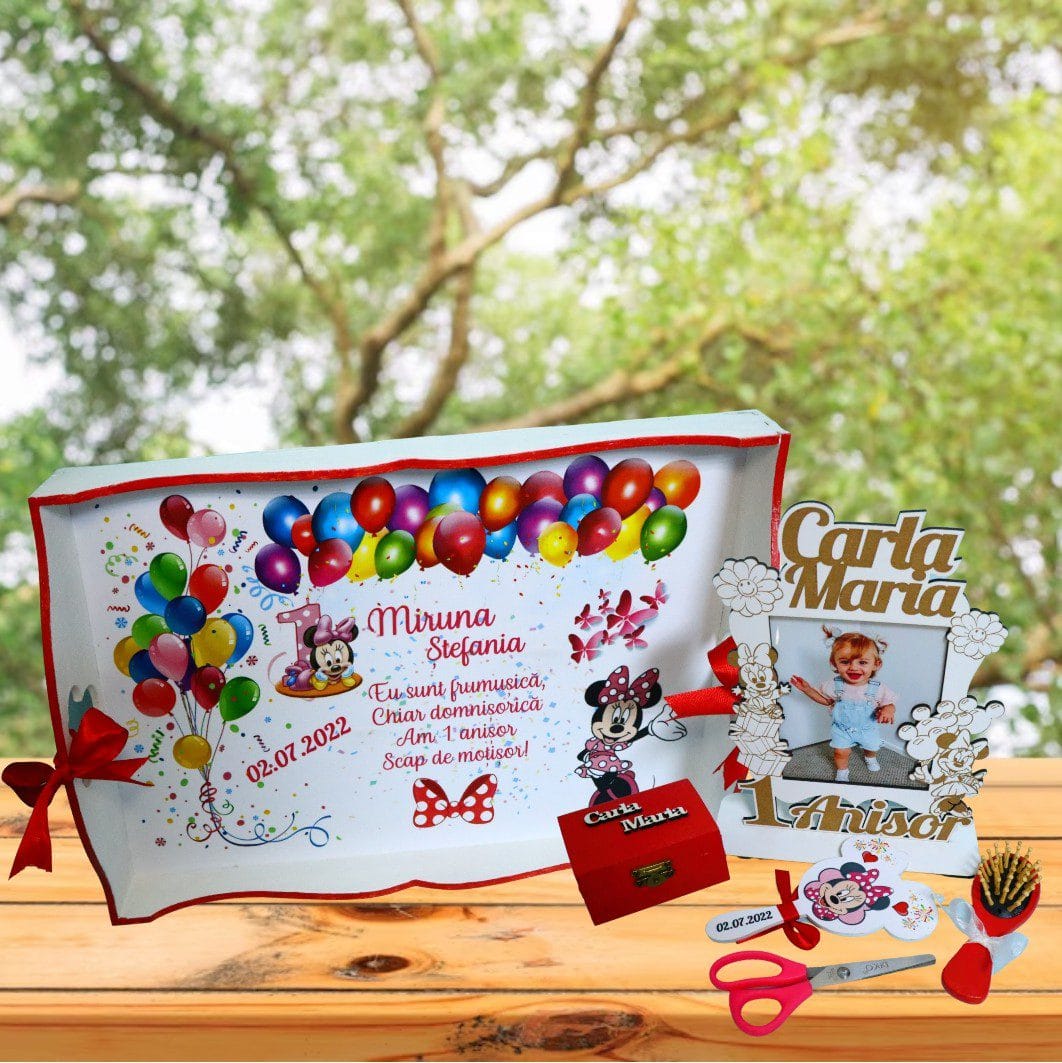 Setul se personalizeaza prin schimbarea numelui copilului si a datei evenimentului, restul textului si grafica este standard.