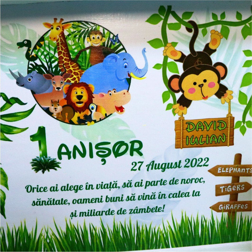 Setul se personalizeaza prin schimbarea numelui copilului si a datei evenimentului, restul textului si grafica este standard.
