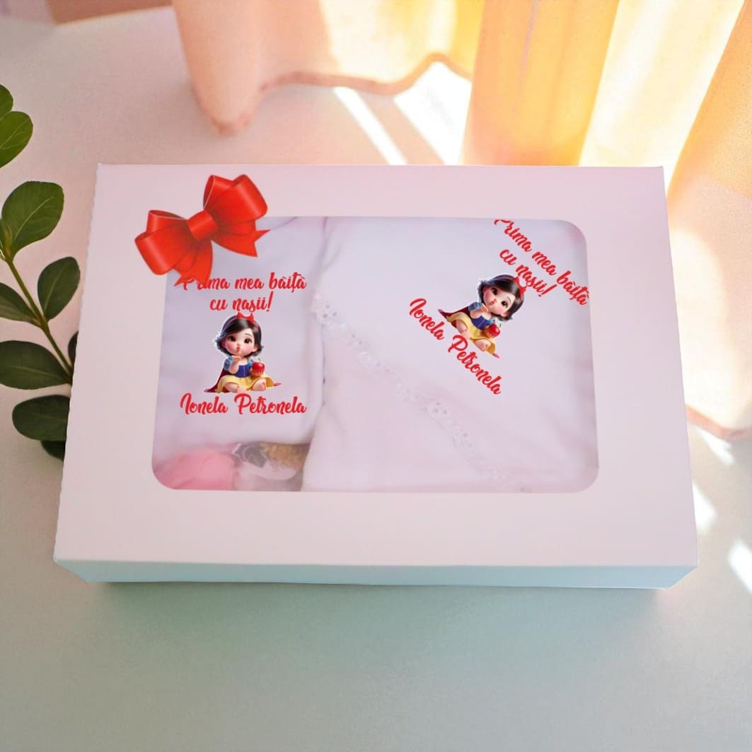 Setul Prima Baita se livreaza intr-o cutie eleganta, alba si cu funda rosie.