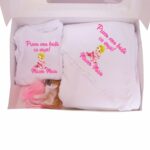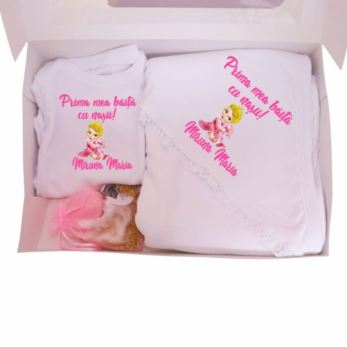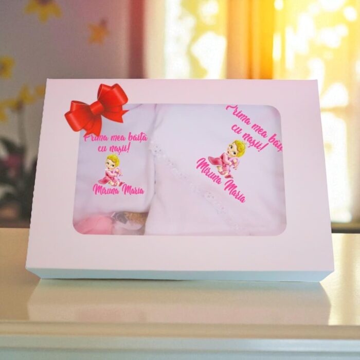 Setul Prima Baita se livreaza intr-o cutie eleganta, alba si cu funda rosie.