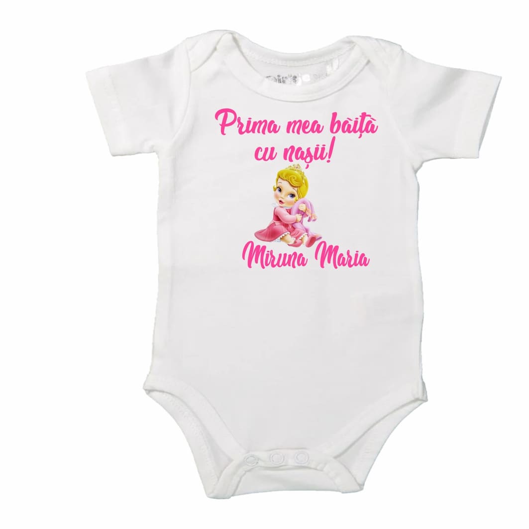 Body din 100% bumbac, personalizat cu nume si mesajul ”Prima mea baita cu nasii!”.