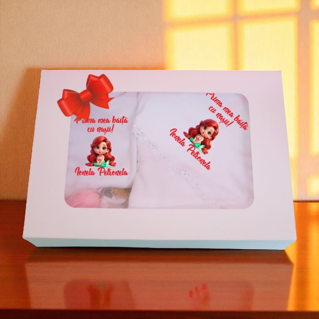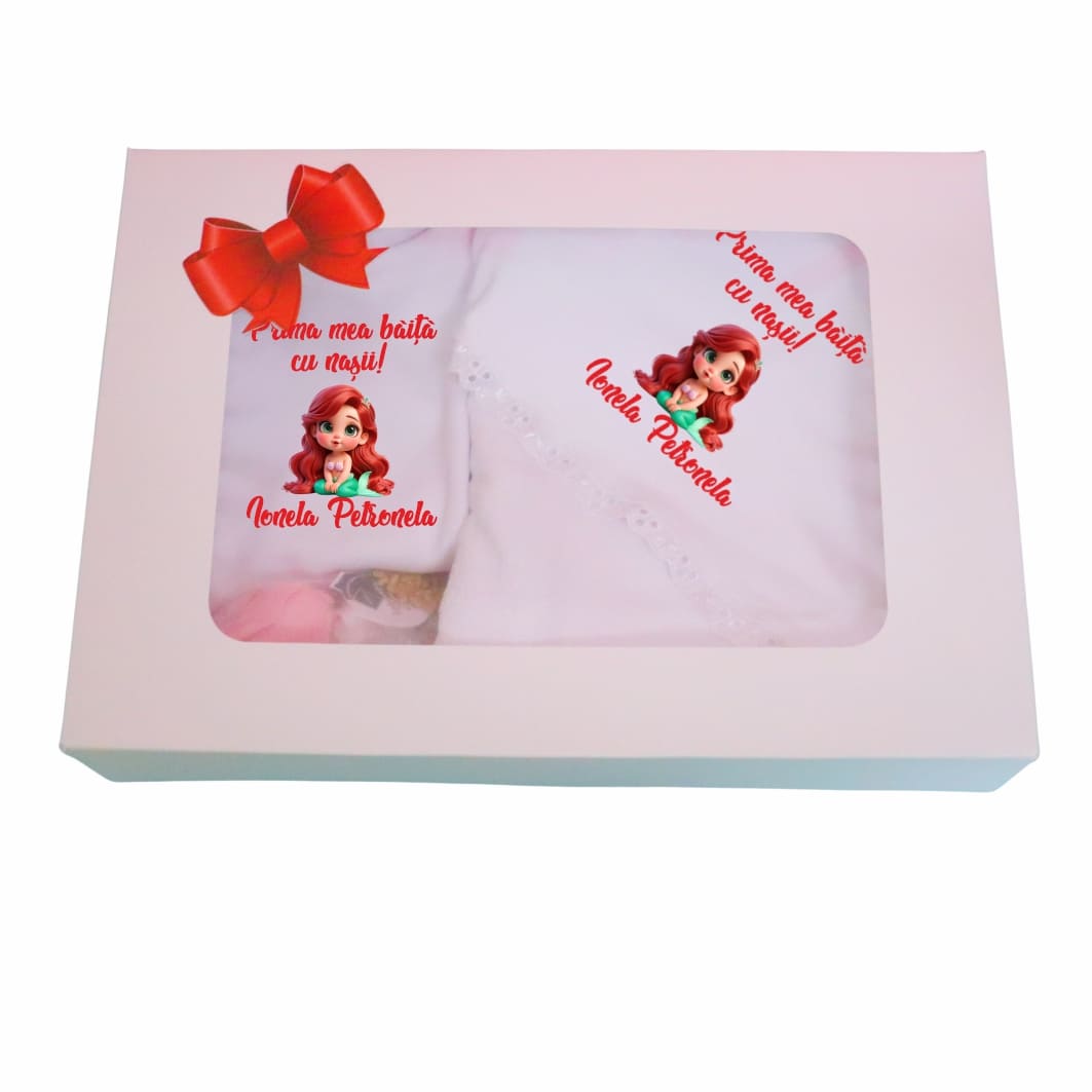 Setul Prima Baita se livreaza intr-o cutie eleganta, alba si cu funda rosie.