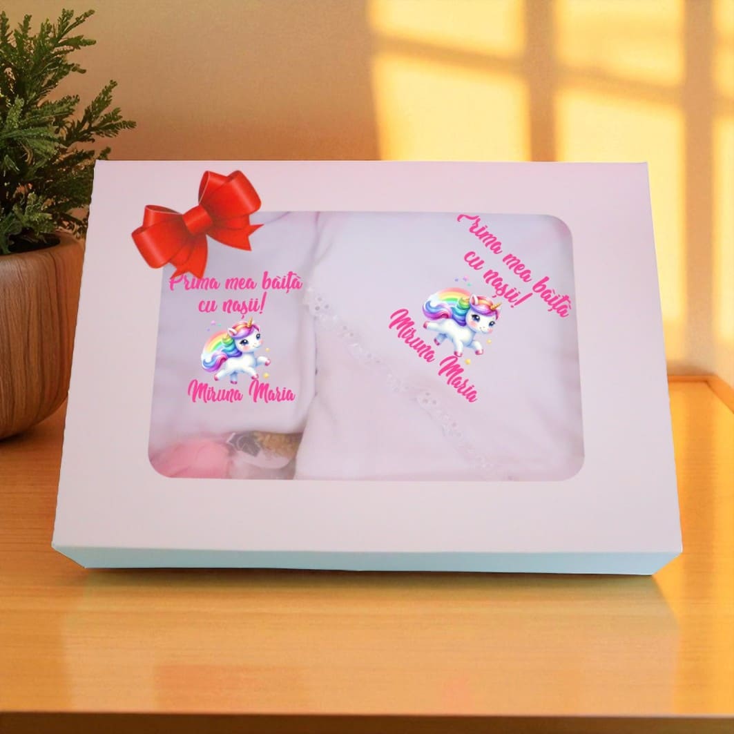 Setul Prima Baita se livreaza intr-o cutie eleganta, alba si cu funda rosie.