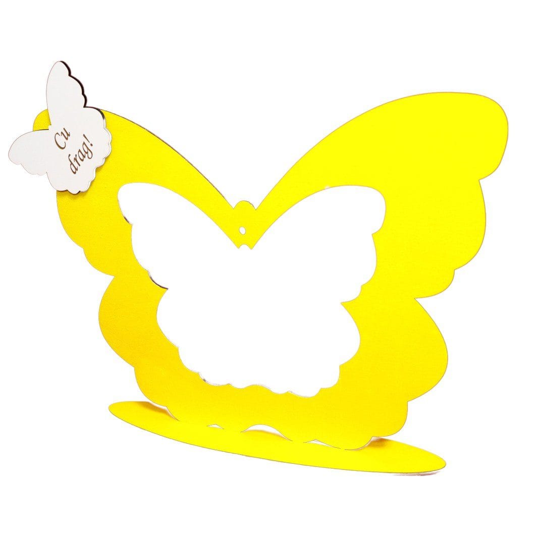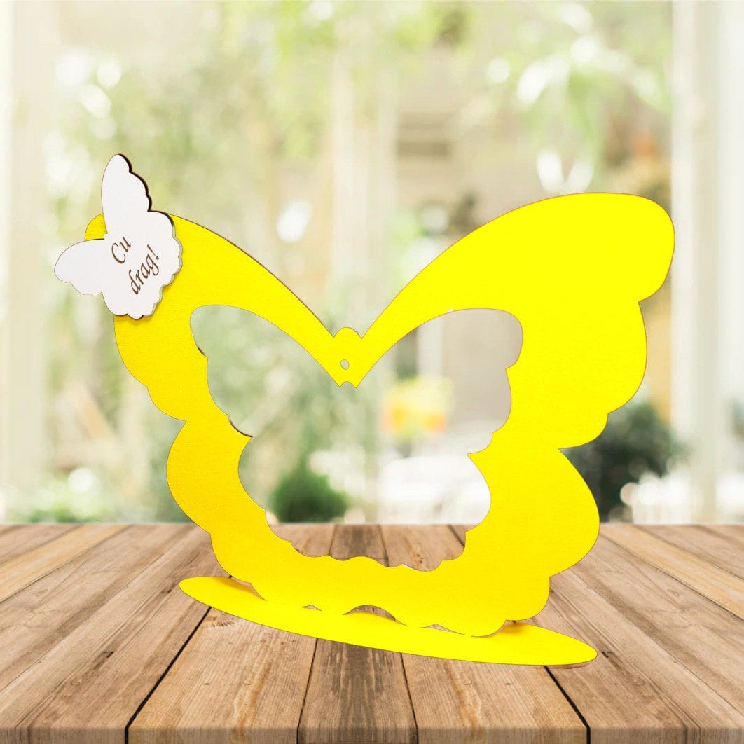 Acest suport glob floral blank din lemn, realizat în formă de fluture și finisat într-o nuanță caldă de galben, este o bază decorativă deosebită, creată pentru aranjamente florale personalizate cu mesaj emoțional.