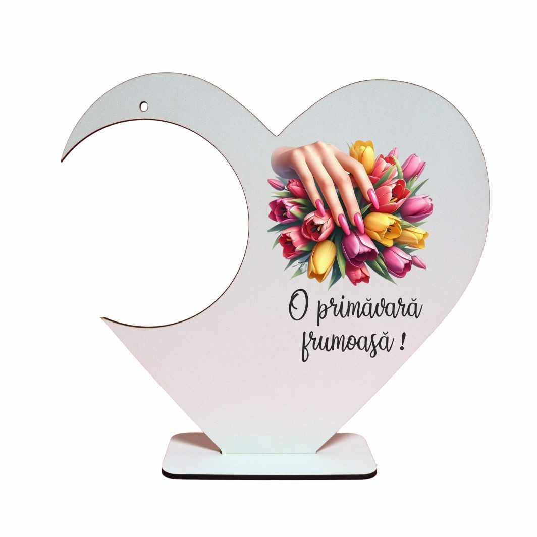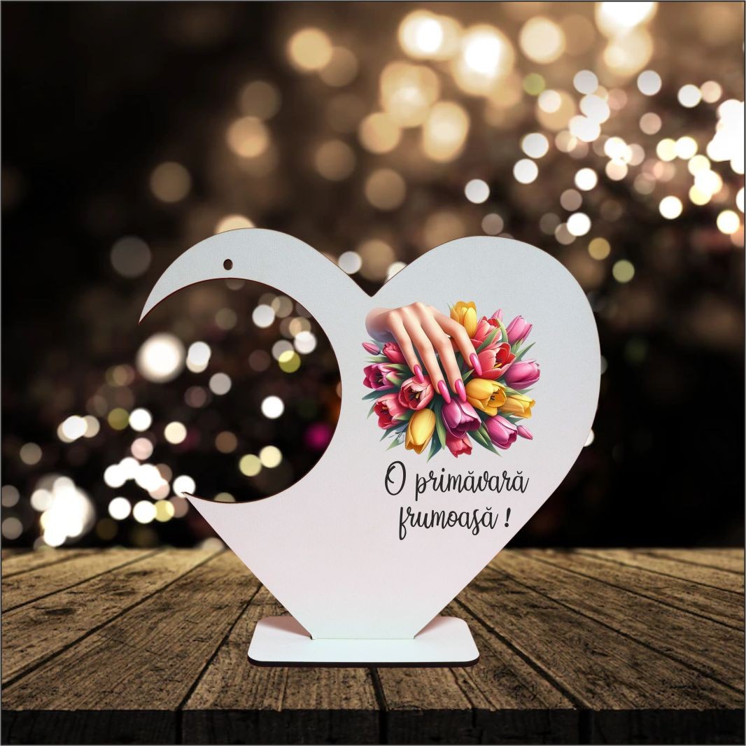 Fabricat din lemn, suportul are un aspect natural și cald, ușor de integrat în decoruri variate – de la aranjamente florale tematice pentru luna martie, până la cadouri simbolice pentru persoane dragi. Forma de inimă adaugă o notă emoțională produsului, fiind asociată cu afecțiunea, aprecierea și gesturile făcute din suflet. Acest lucru face ca suportul să fie potrivit pentru cadouri de primăvară, evenimente speciale sau decoruri realizate manual.