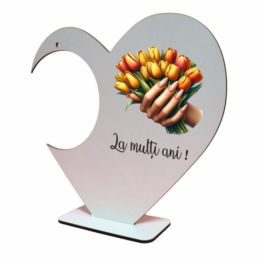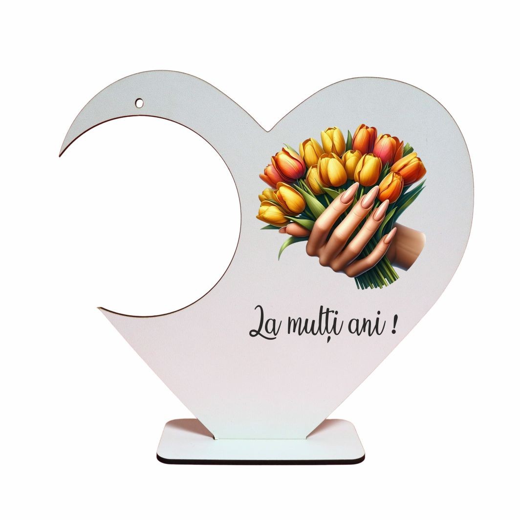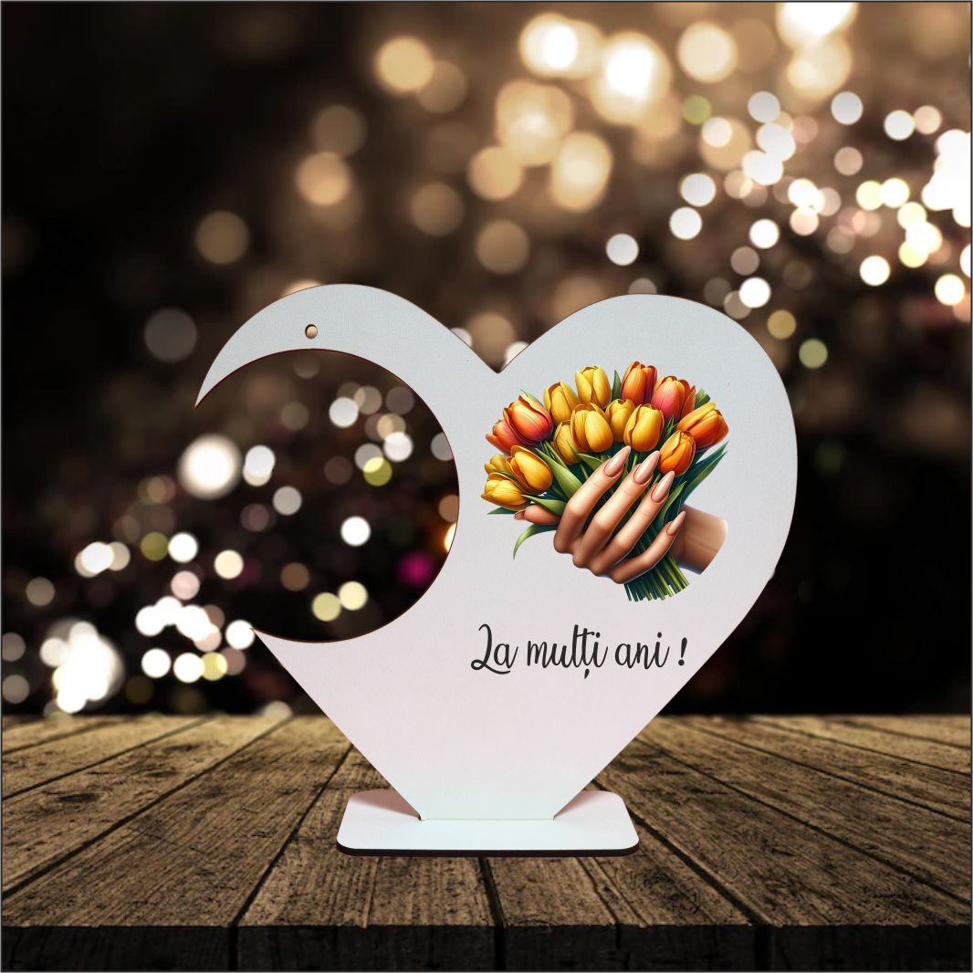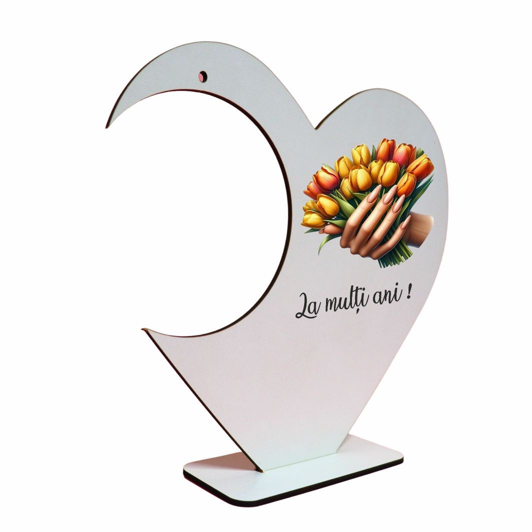 Fabricat din lemn, suportul are un aspect natural și cald, ușor de integrat în decoruri variate – de la aranjamente florale tematice pentru luna martie, până la cadouri simbolice pentru persoane dragi. Forma de inimă adaugă o notă emoțională produsului, fiind asociată cu afecțiunea, aprecierea și gesturile făcute din suflet. Acest lucru face ca suportul să fie potrivit pentru cadouri de primăvară, evenimente speciale sau decoruri realizate manual.