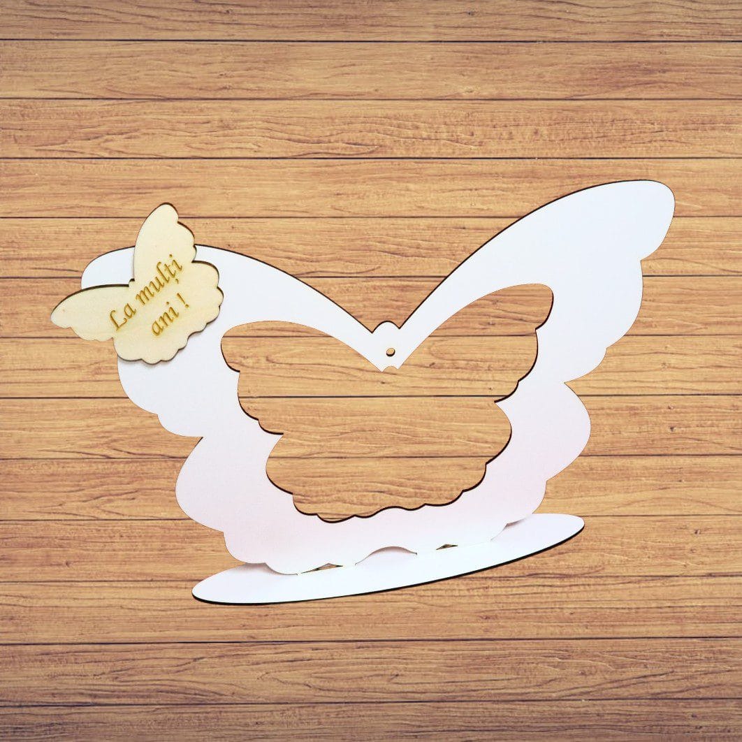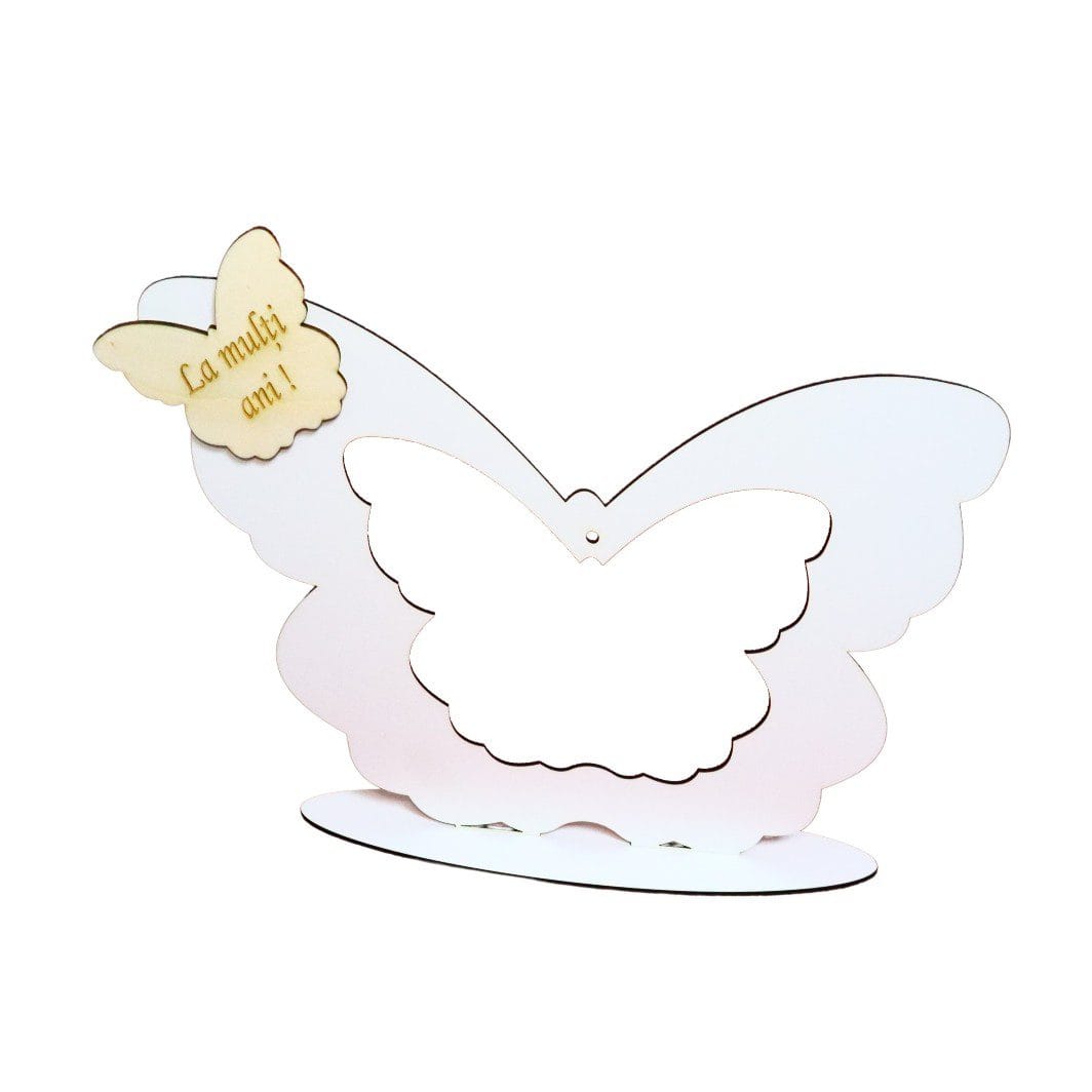 Suport in forma de fluture pentru globurile de sticla/plastic cu diametrul de maxim 10 cm si cu mesajul „La multi ani!” gravat.