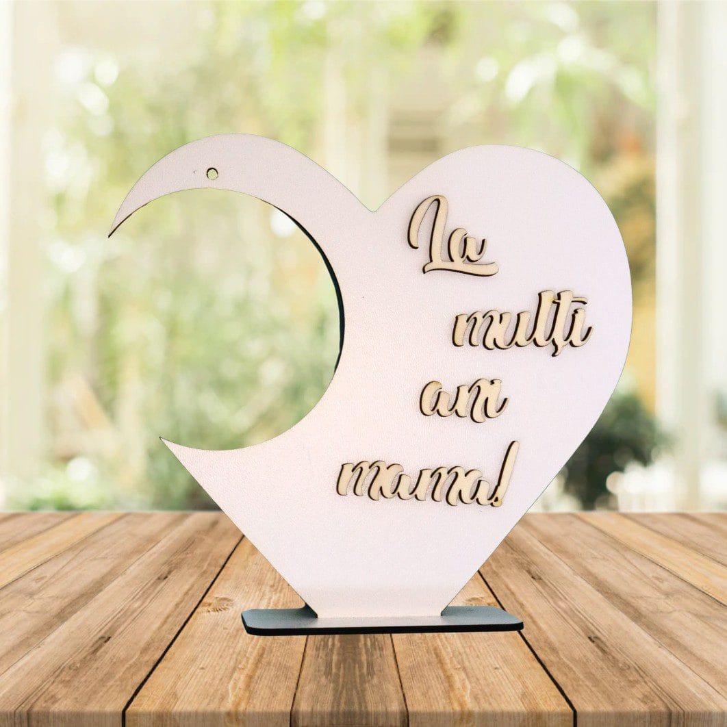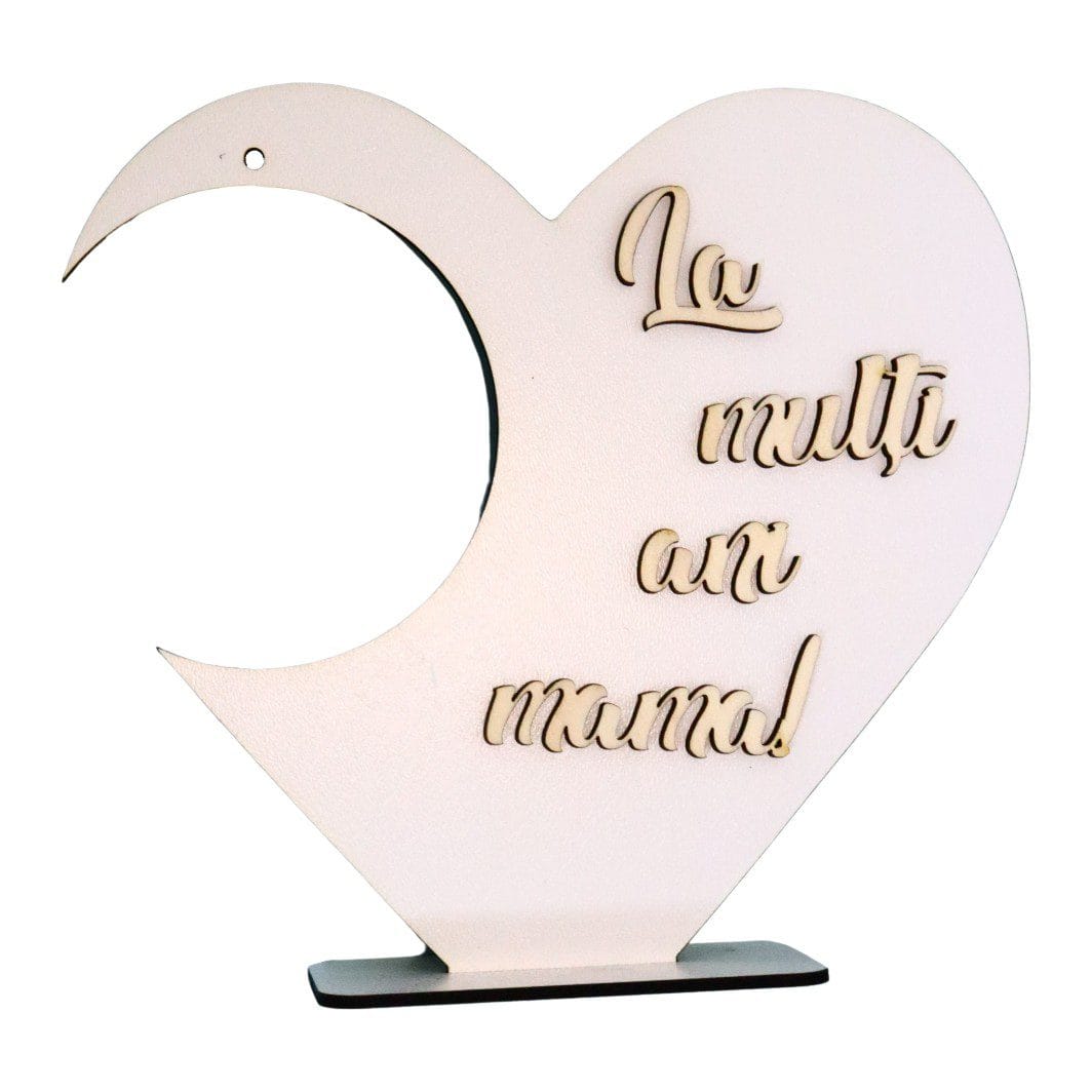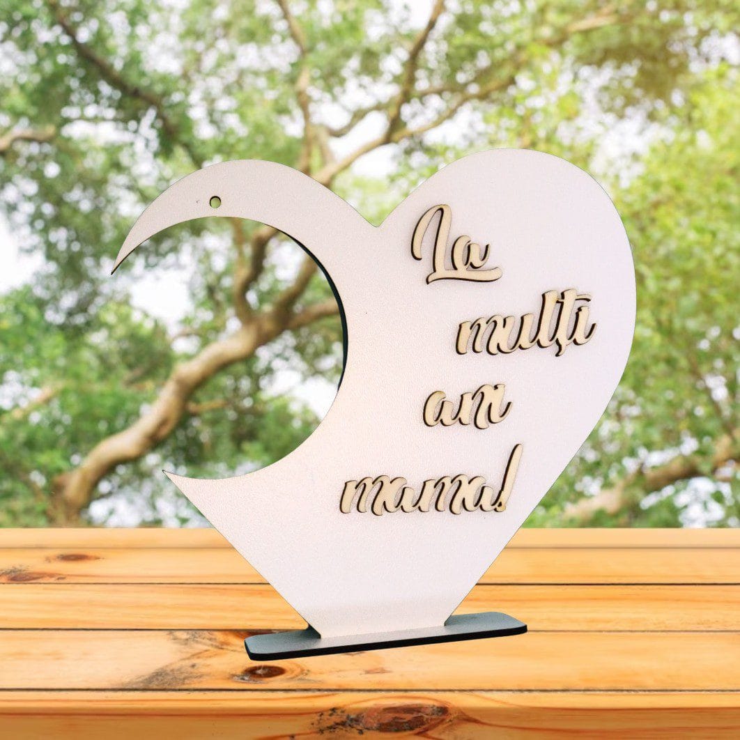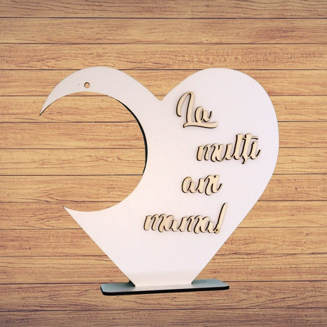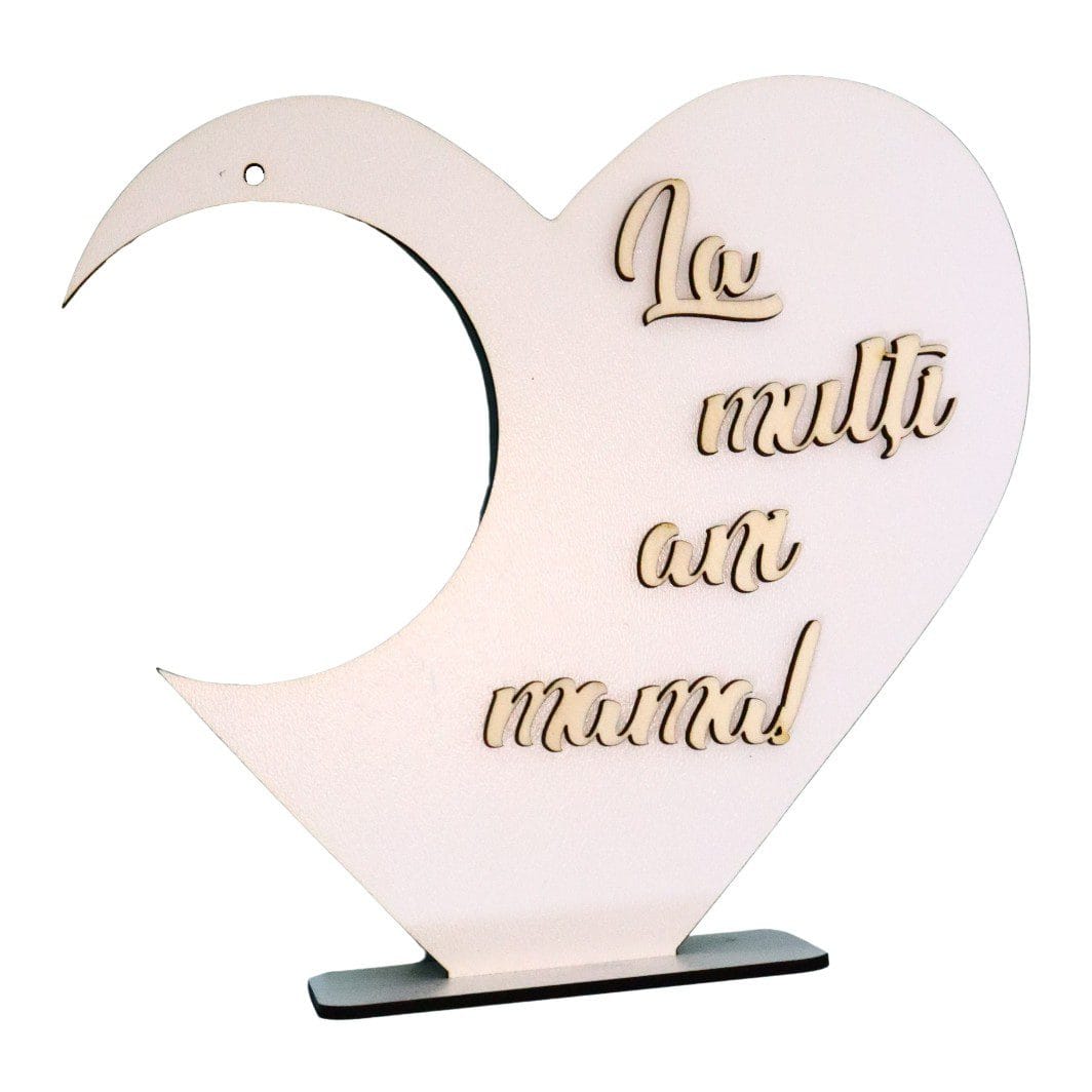 Suport in forma de inima pentru globurile de sticla/plastic si cu mesajul „La multi ani mama!” aplicat 3D.