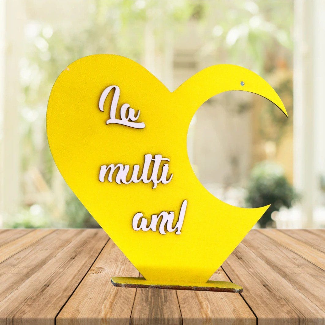 Suport in forma de inima pentru globurile de sticla/plastic si cu mesajul „La multi ani!” aplicat 3D.