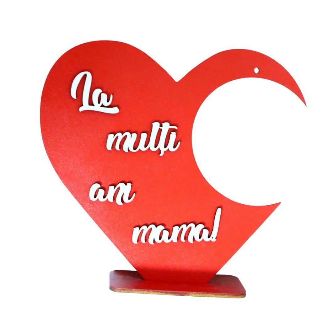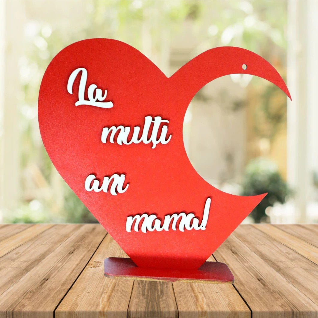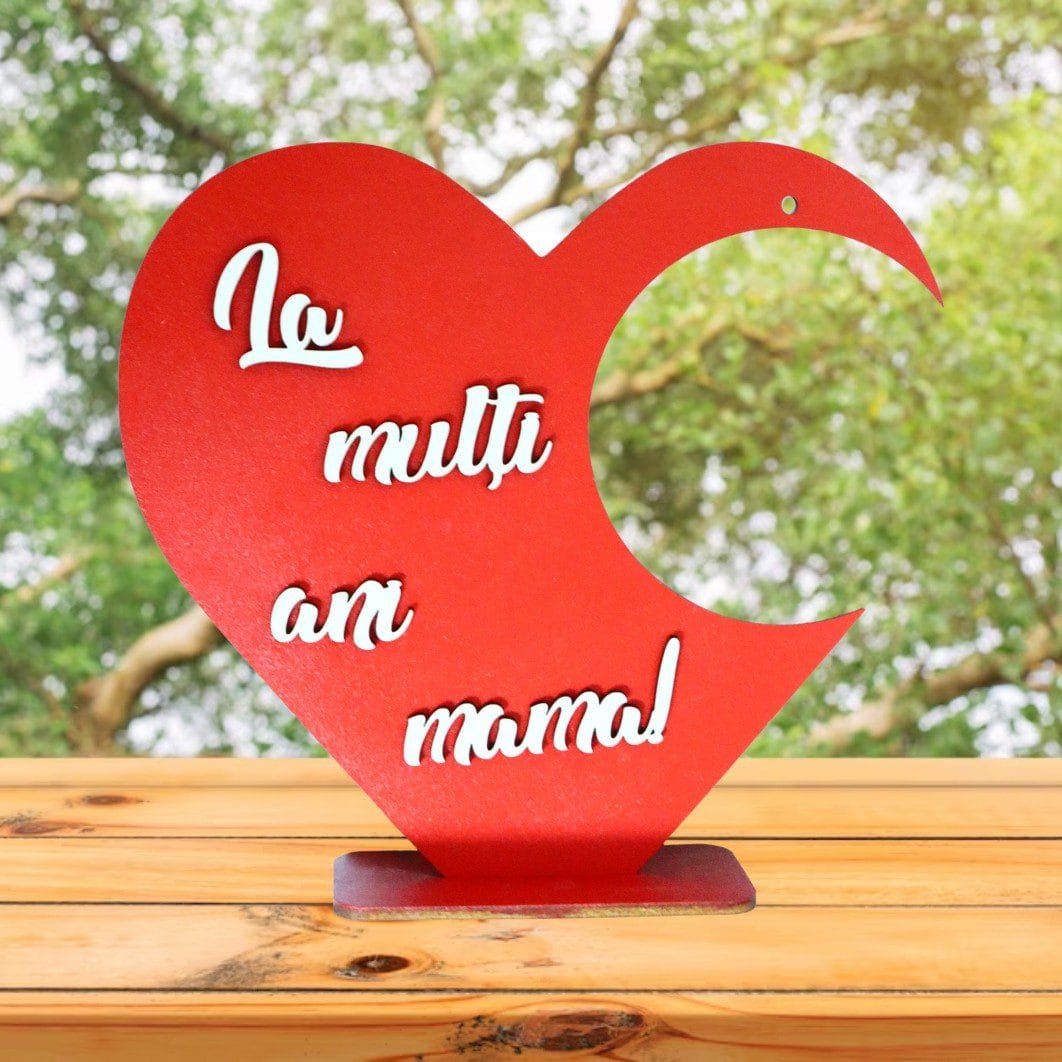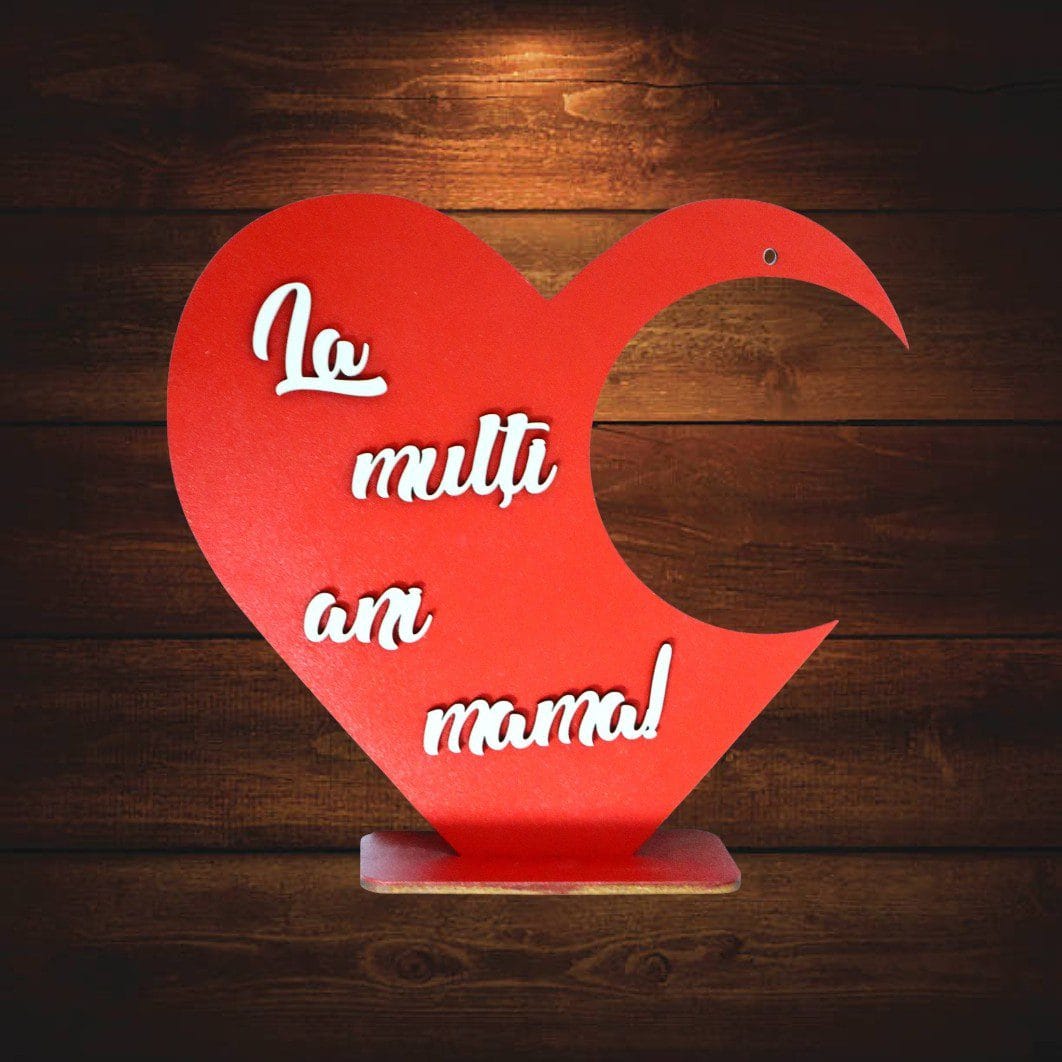 Suport in forma de inima pentru globurile de sticla/plastic si cu mesajul „La multi ani mama!” aplicat 3D.
