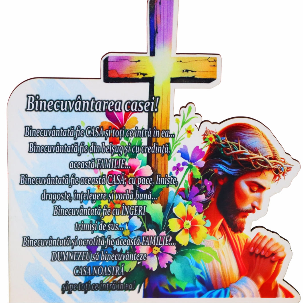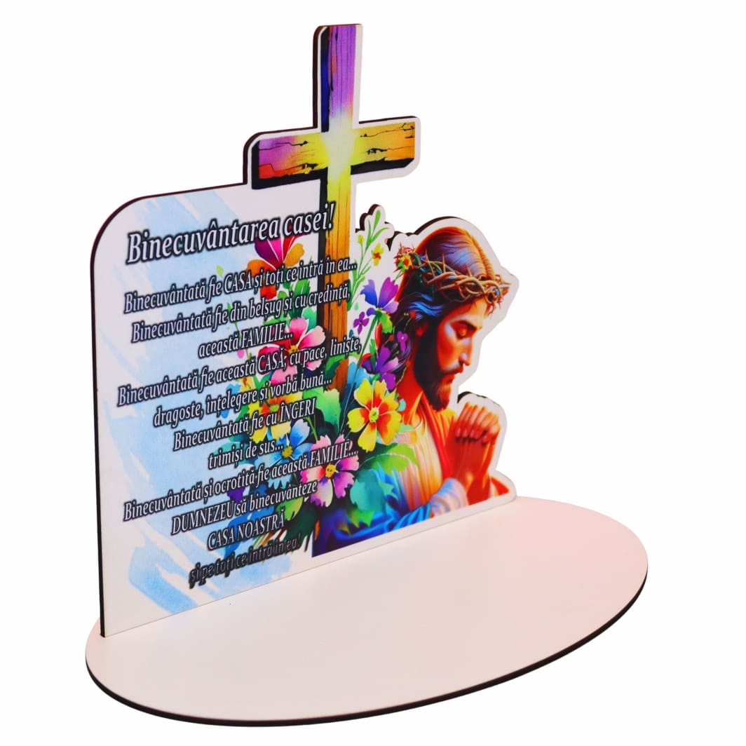 Realizat din lemn HDF, un material rezistent și stabil, acest suport lumanare Paste se remarcă prin designul său multicolor și mesajul cu semnificație profundă – Binecuvântarea Casei. Dimensiunile de 20 x 19,5 cm îl fac potrivit pentru a fi așezat pe masa de Paște, într-un decor festiv, alături de preparatele tradiționale, sau într-un spațiu special din locuință, unde să aducă un plus de armonie și liniște.