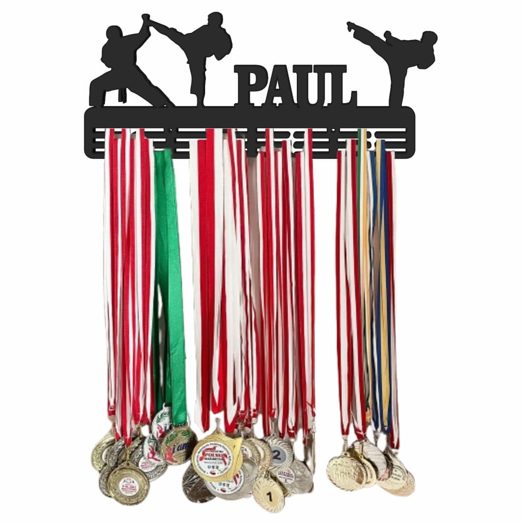 Transformă medaliile în inspirație zilnică! Suportul nostru de medalii din lemn (HDF), cu design negru și personalizare completă, evidențiază performanțele tale în Karate. Este ideal pentru camera copiilor, sala de antrenament sau birou și oferă un mod elegant de a expune trofeele câștigate.
