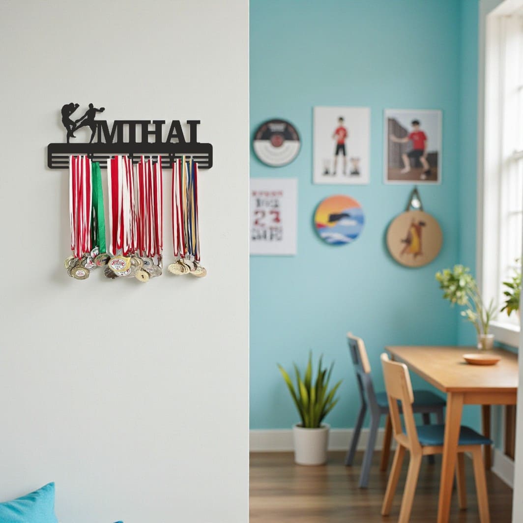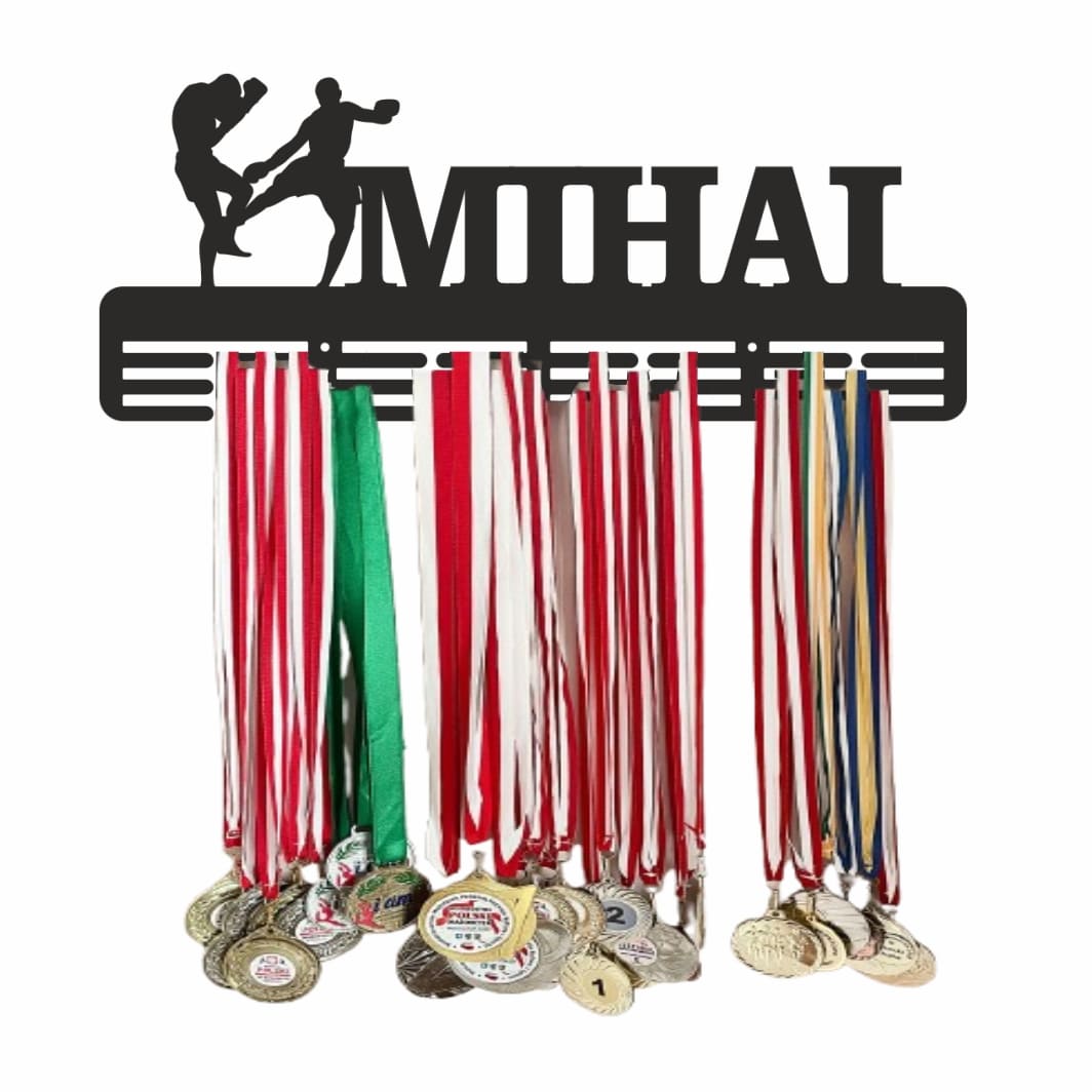 Transformă medaliile în inspirație zilnică! Suportul nostru de medalii din lemn (HDF), cu design negru și personalizare completă, evidențiază performanțele tale în Kickboxing. Este ideal pentru camera copiilor, sala de antrenament sau birou și oferă un mod elegant de a expune trofeele câștigate.