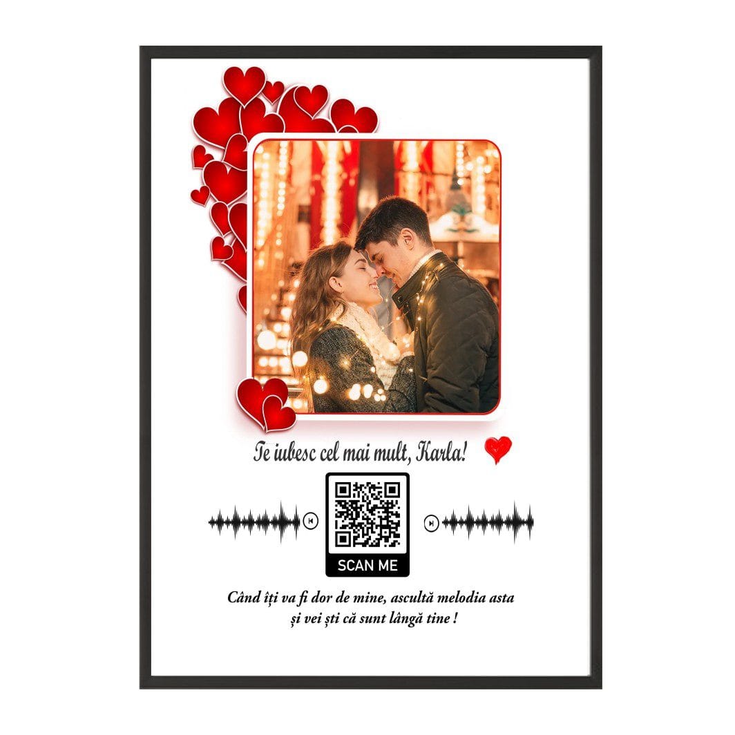 Fie că este vorba de prima melodie pe care ați ascultat-o împreună sau de piesa care vă definește relația, codul QR va face ca tabloul să fie și mai special. Personalizarea tabloului este ușoară; după plasarea comenzii, vei fi contactat pentru a oferi numele, fotografia și melodia dorită, astfel încât fiecare detaliu să reflecte unicitatea relației voastre.