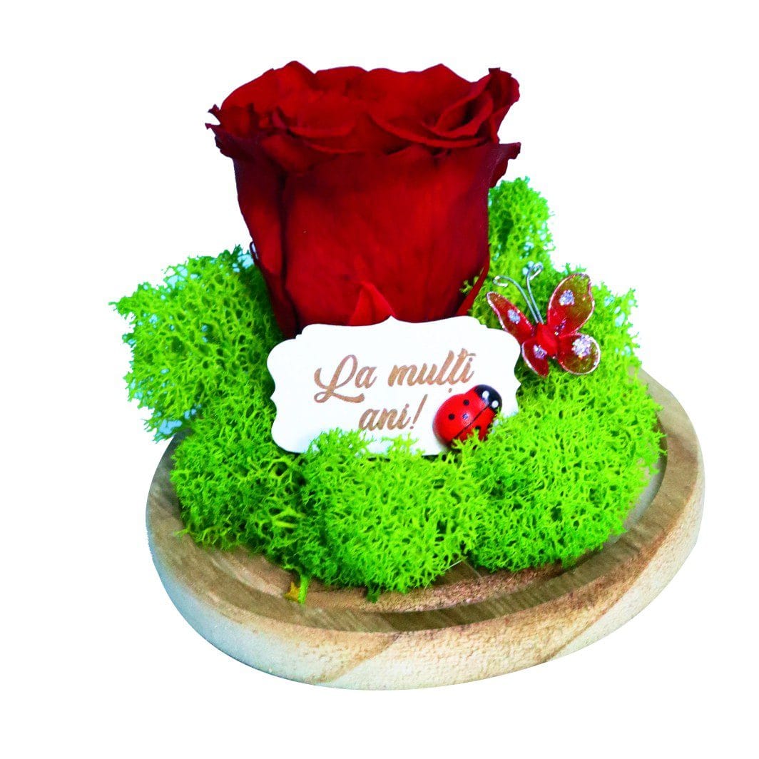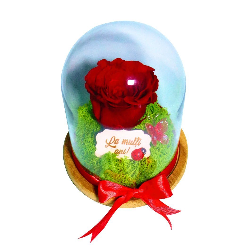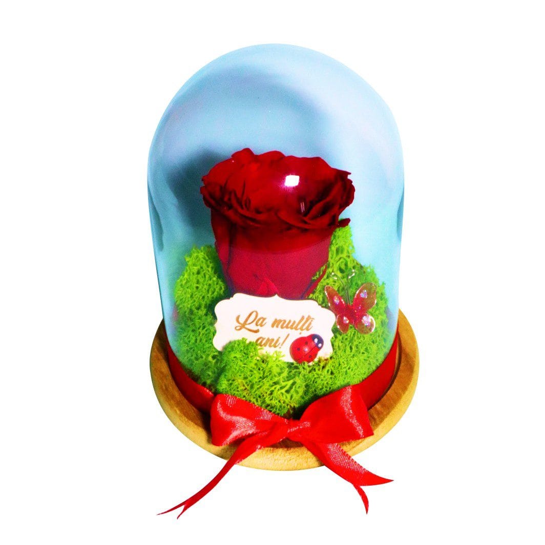 Elementul central al acestui trandafir criogenat este floarea naturală, atent conservată printr-un proces complex de criogenare, care îi permite să își păstreze frumusețea, textura și culoarea intensă pentru o perioadă de până la 25 de ani, fără a necesita apă sau lumină solară. Trandafirul este așezat pe un pat decorativ de licheni și protejat de o cupolă elegantă din sticlă, care îi oferă un aspect premium și îl transformă într-o piesă decorativă deosebită. Întregul aranjament este completat de o plăcuță cu mesaj „La mulți ani”, ce adaugă o notă personală și festivă.