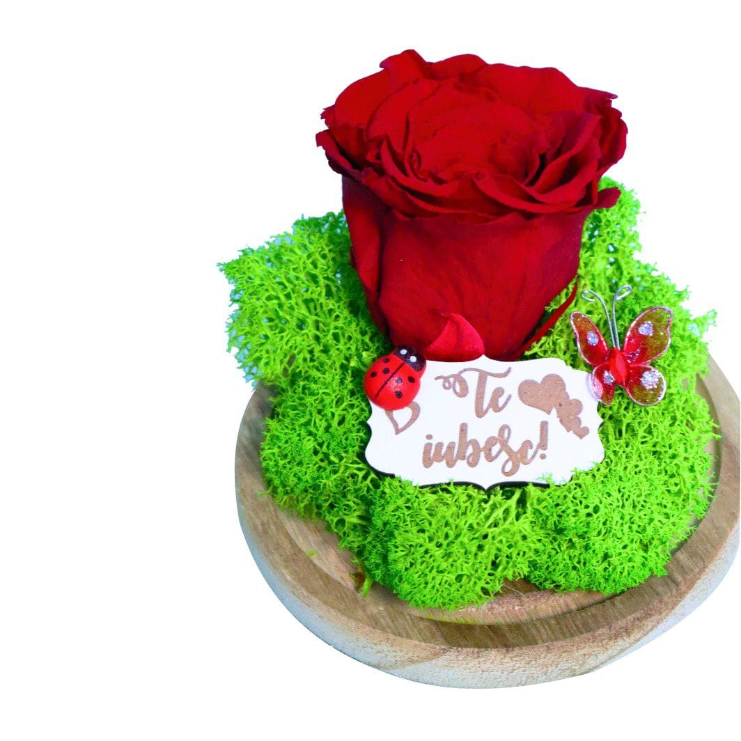 Elementul central al acestui trandafir criogenat este floarea atent conservată, așezată pe un pat decorativ de licheni și protejată de o cupolă elegantă din sticlă. Întregul design este completat de o plăcuță decorativă cu mesaj „te iubesc”, care oferă aranjamentului un caracter personal și emoțional. Trandafirul, supranumit „Regele florilor”, simbolizează iubirea, pasiunea, frumusețea și fericirea, fiind una dintre cele mai apreciate flori oferite femeilor.