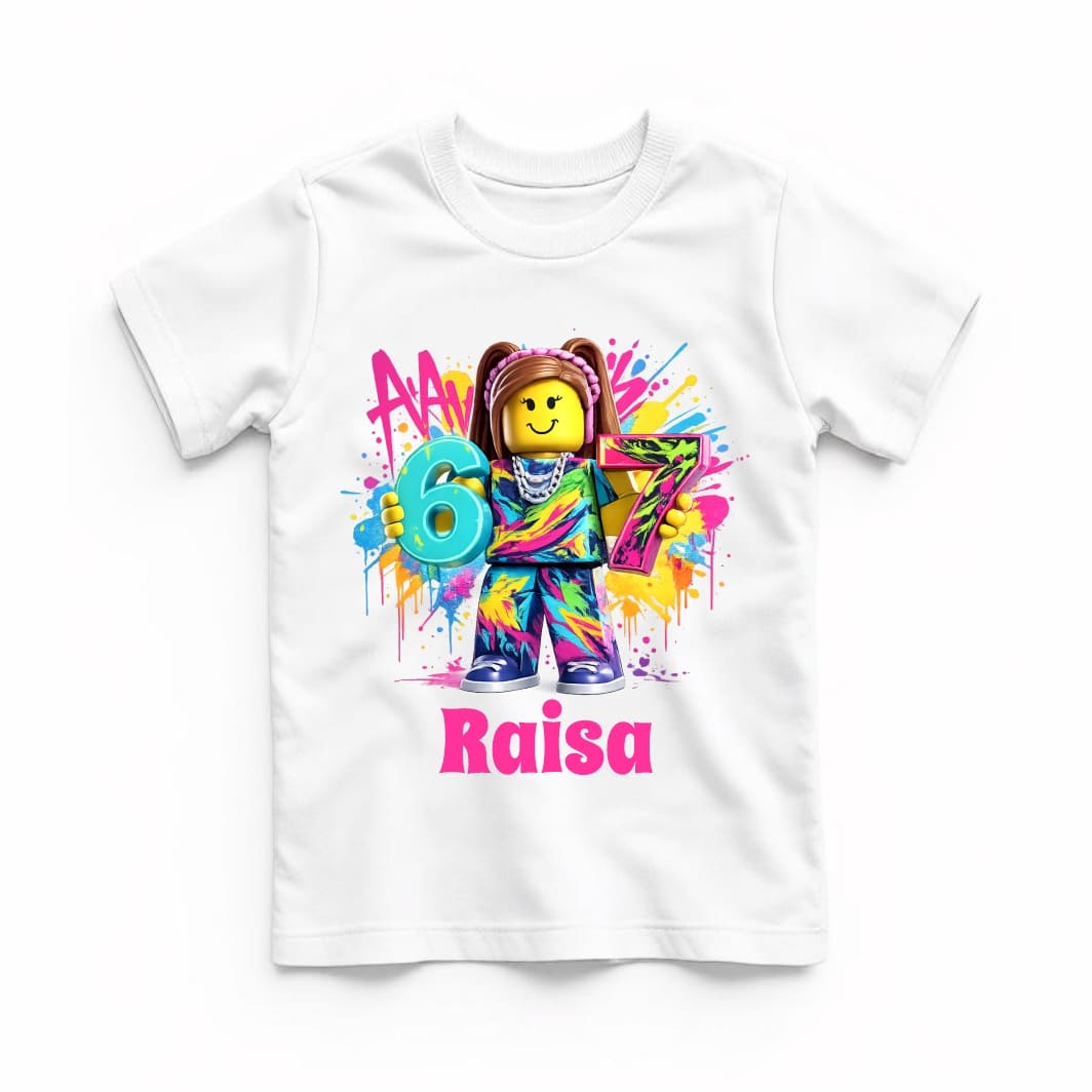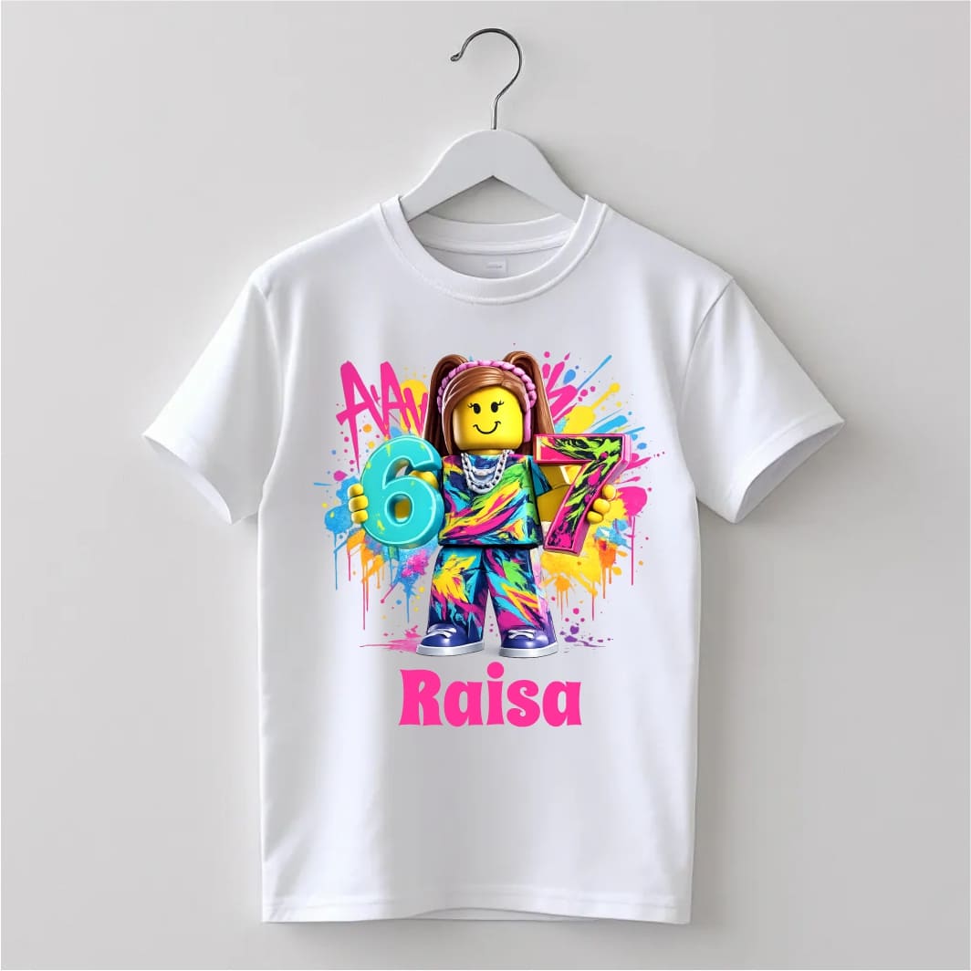 Confecționat din bumbac moale și confortabil, tricoul este ideal pentru purtare pe tot parcursul zilei, oferind libertate de mișcare și o senzație plăcută pe piele. Designul modern și colorat, inspirat de vibe-ul și stilul Roblox Girl, Six Seven, aduce un plus de personalitate și originalitate ținutei de aniversare.