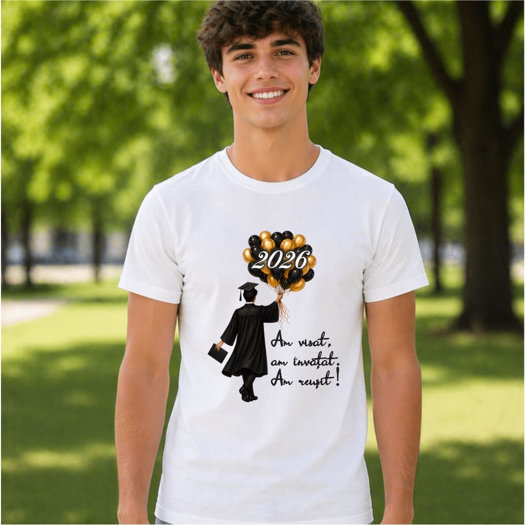 Realizat din materiale confortabile și rezistente, tricoul este ideal pentru festivități, petreceri de absolvire sau ca amintire de neuitat. Este mai mult decât o piesă vestimentară — este un simbol al drumului parcurs și al visurilor care abia încep.