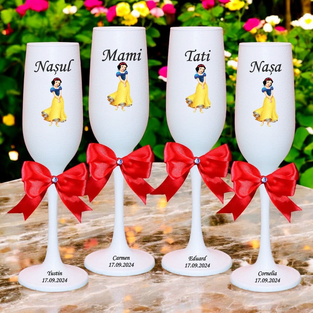 Setul 4 Pahare Botez, Personalizate, Alba ca Zapada, Alb, 215ml, PHB044 combină frumusețea poveștilor clasice cu eleganța sticlei personalizate. Este un accesoriu esențial pentru orice botez tematic și un simbol al momentelor pline de emoție și bucurie. Cu o întreținere simplă și un design care atrage privirile, acest set de pahare este alegerea ideală pentru părinții și nașii care iubesc detaliile rafinate și amintirile de durată.
