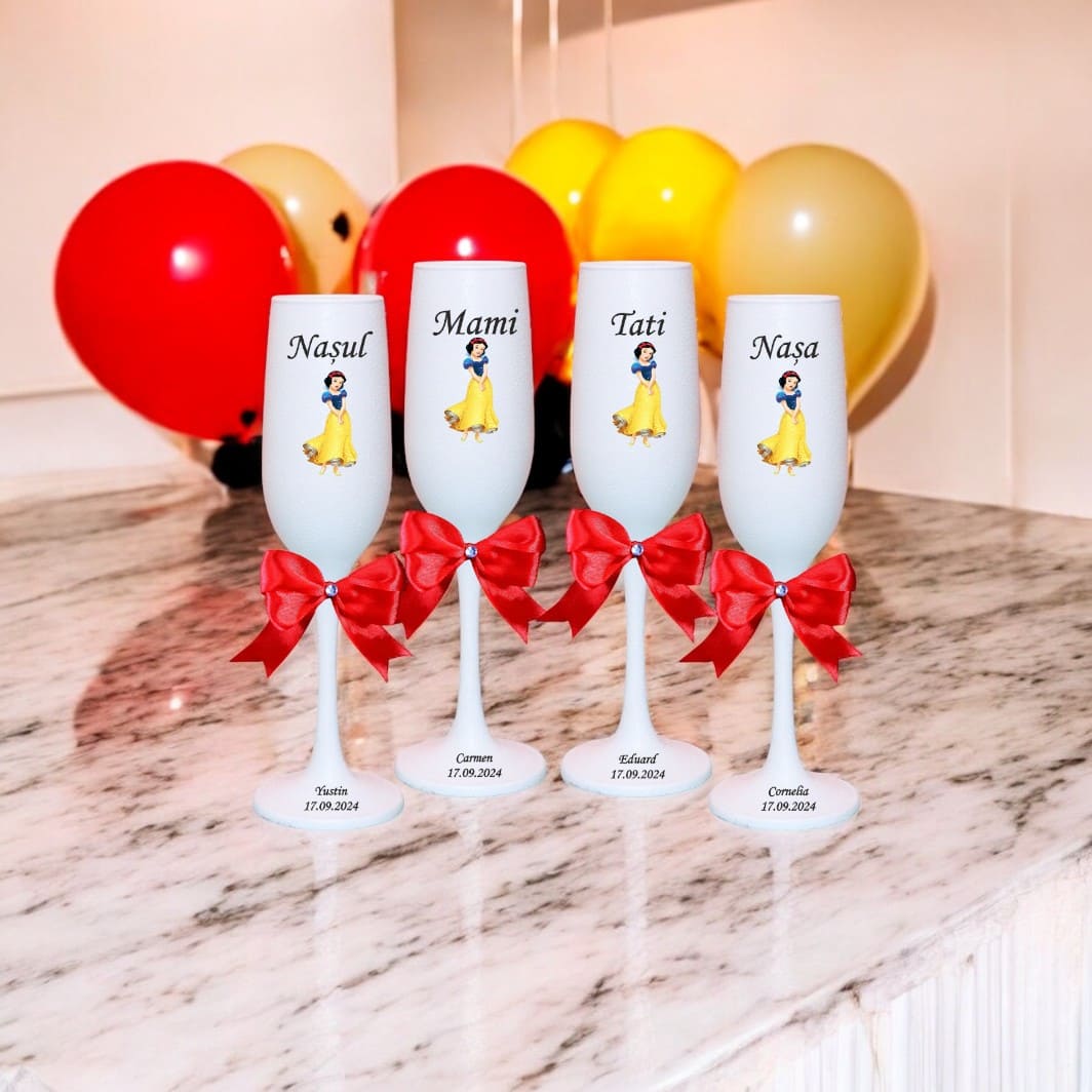 Acest set de pahare personalizate de botez este perfect pentru părinți, nași și invitați care își doresc un accesoriu elegant și tematic pentru masa de sărbătoare. Designul adorabil cu Alba ca Zapada, Alb adaugă un aer jucaus, transformând fiecare moment într-o amintire de neuitat. Fiecare pahar este finisat manual cu grijă, iar printul UV garantează o imagine clară, detaliată și permanentă.