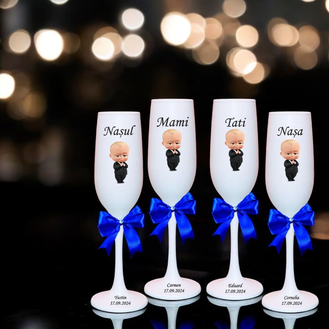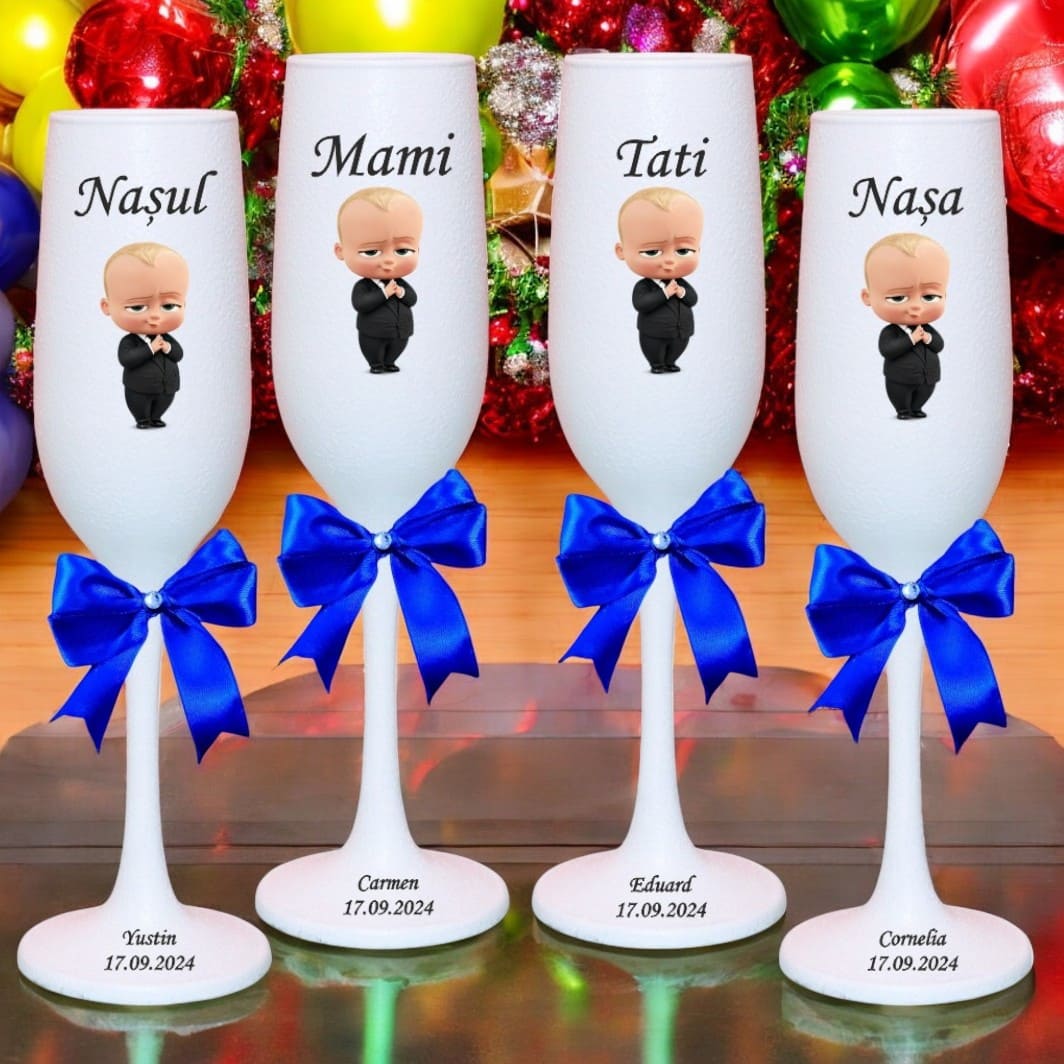 Acest set de pahare botez personalizate este perfect pentru părinți, nași și invitați care își doresc un accesoriu elegant și tematic pentru masa de sărbătoare. Designul adorabil Baby Boss adaugă un aer jucaus, transformând fiecare moment într-o amintire de neuitat. Fiecare pahar este finisat manual cu grijă, iar printul UV garantează o imagine clară, detaliată și permanentă.