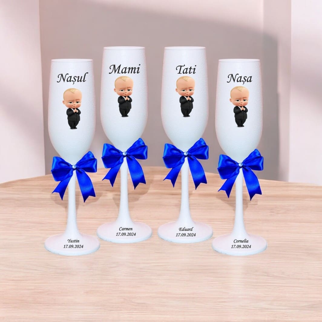 Setul de 4 Pahare Botez Personalizate – Baby Boss, model PHB003 este alegerea ideală pentru o petrecere de botez elegantă și memorabilă. Realizate cu atenție la detalii, aceste pahare din sticlă de calitate superioară aduc un plus de rafinament momentelor speciale dedicate bebelușului. Cu un design inspirat din Disney, fiecare pahar este personalizat prin print UV rezistent, oferind un aspect luminos și o durabilitate de lungă durată.