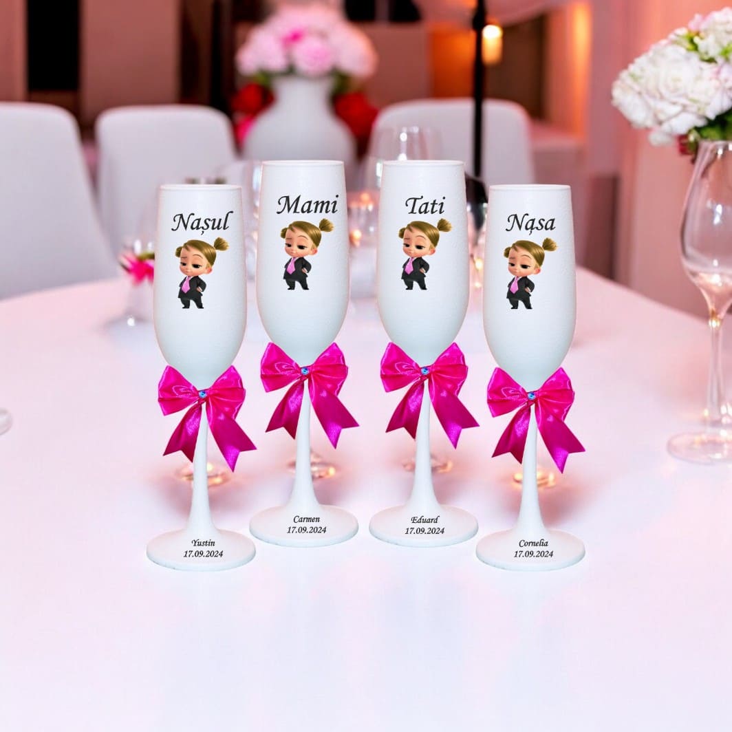Setul de pahare botez personalizate cu Baby Boss, Fetita, Roz este o alegere inspirată pentru a celebra primul eveniment important din viața copilului. Paharele pot fi folosite atât în timpul petrecerii, cât și ulterior, ca amintire de suflet pentru familie și nași. Combinația dintre albul pur, fundița colorată și printul de poveste creează un ansamblu armonios, potrivit pentru tematici de botez elegante.
