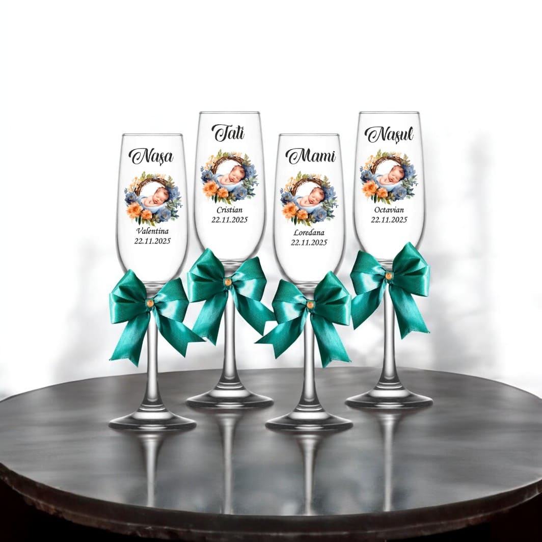 Set 4 Pahare Botez Personalizate, Floral, Verde, PBT010