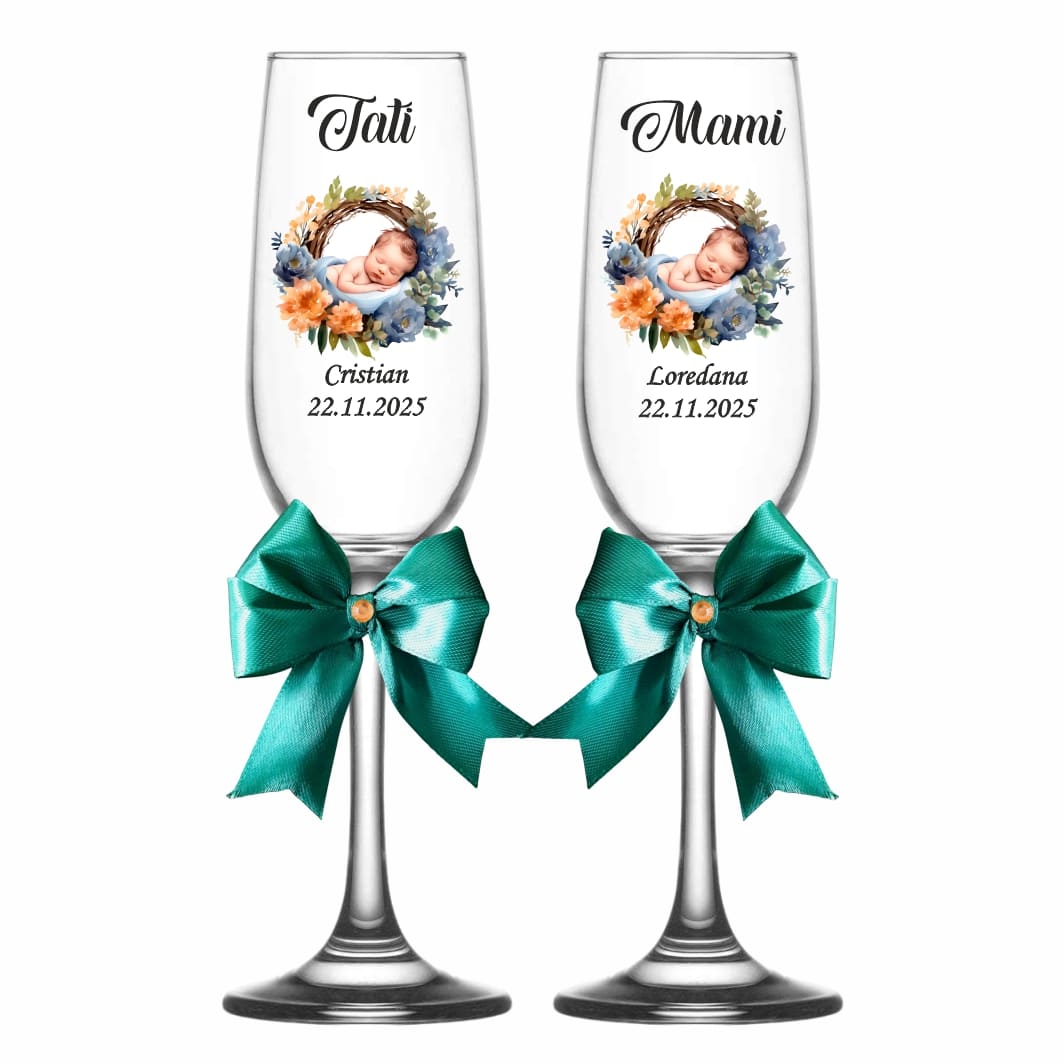 Setul PBT010 – Floral, Verde este alegerea ideală pentru părinți și nași care doresc o tematică naturală, veselă și plină de culoare. Paharele personalizate pot fi utilizate atât la momentul tăierii moțului sau al toastului festiv, cât și ca decor fotografic sau suvenir de amintire.