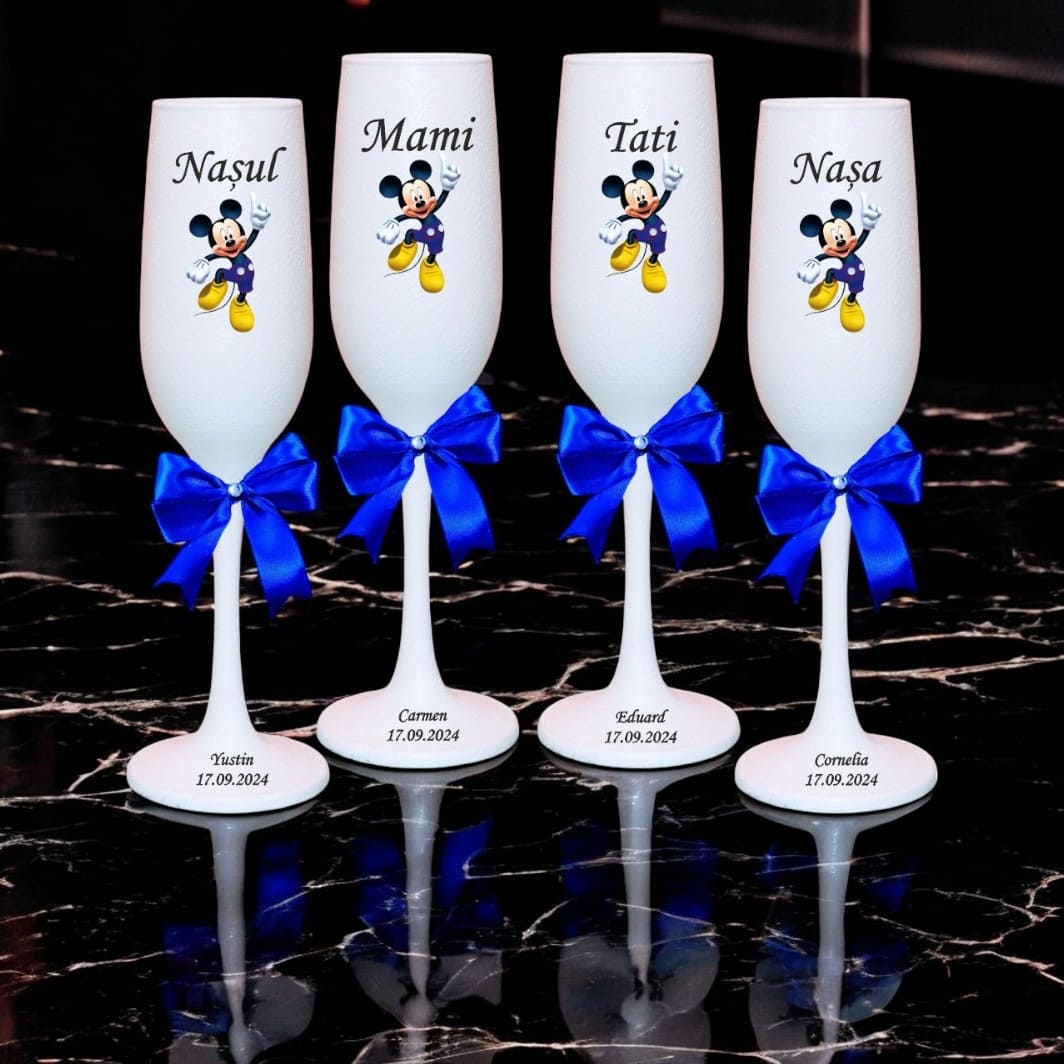 Setul de pahare personalizate Mickey este o alegere inspirată pentru a celebra primul eveniment important din viața copilului. Paharele pot fi folosite atât în timpul petrecerii, cât și ulterior, ca amintire de suflet pentru familie și nași. Combinația dintre albul pur, fundița colorată și printul de poveste creează un ansamblu armonios, potrivit atât pentru fetițe, cât și pentru tematici de botez elegante.
