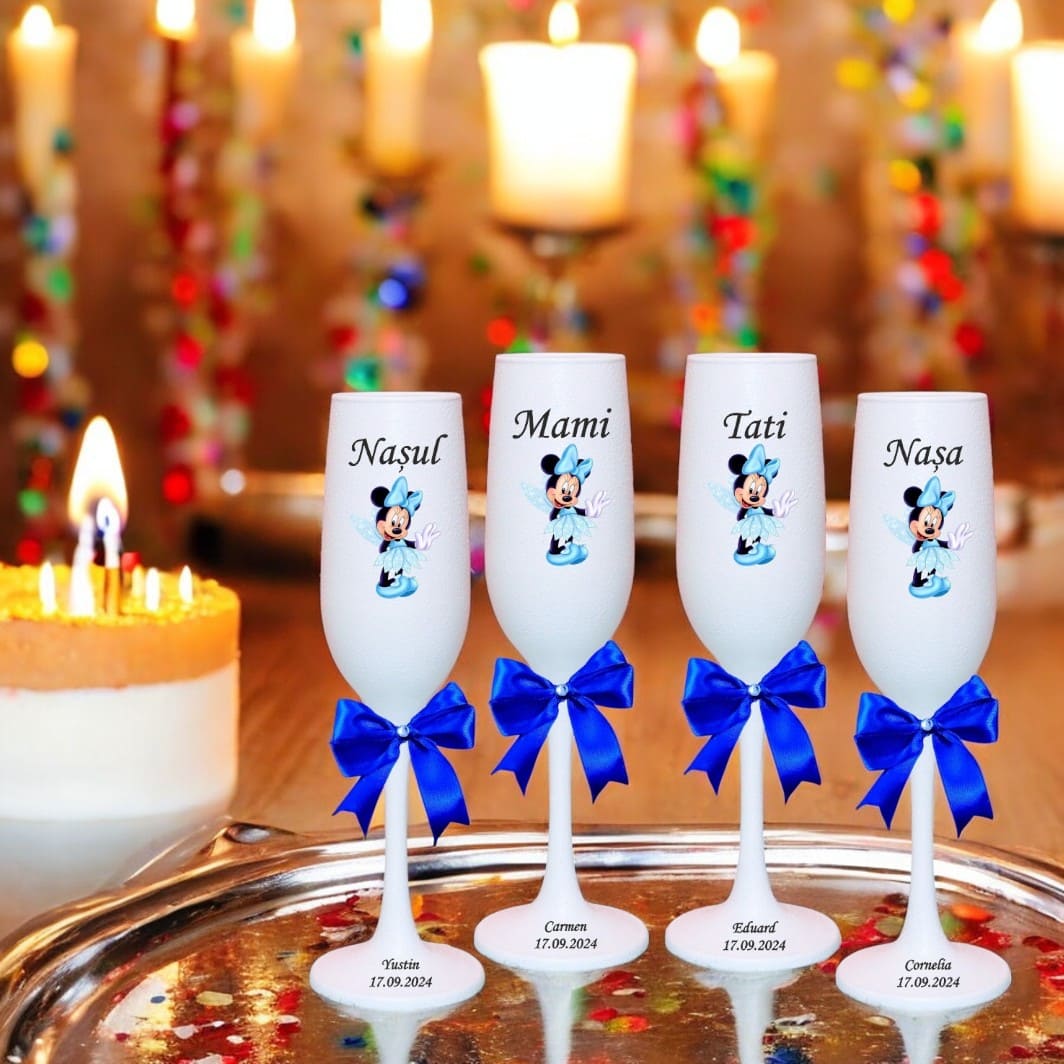 Setul de pahare personalizate Minnie, Albastra este o alegere inspirată pentru a celebra primul eveniment important din viața copilului. Paharele pot fi folosite atât în timpul petrecerii, cât și ulterior, ca amintire de suflet pentru familie și nași. Combinația dintre albul pur, fundița colorată și printul de poveste creează un ansamblu armonios, potrivit atât pentru fetițe, cât și pentru tematici de botez elegante.
