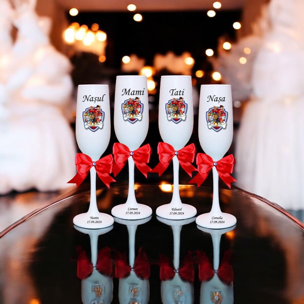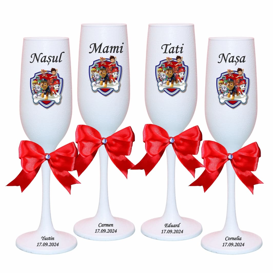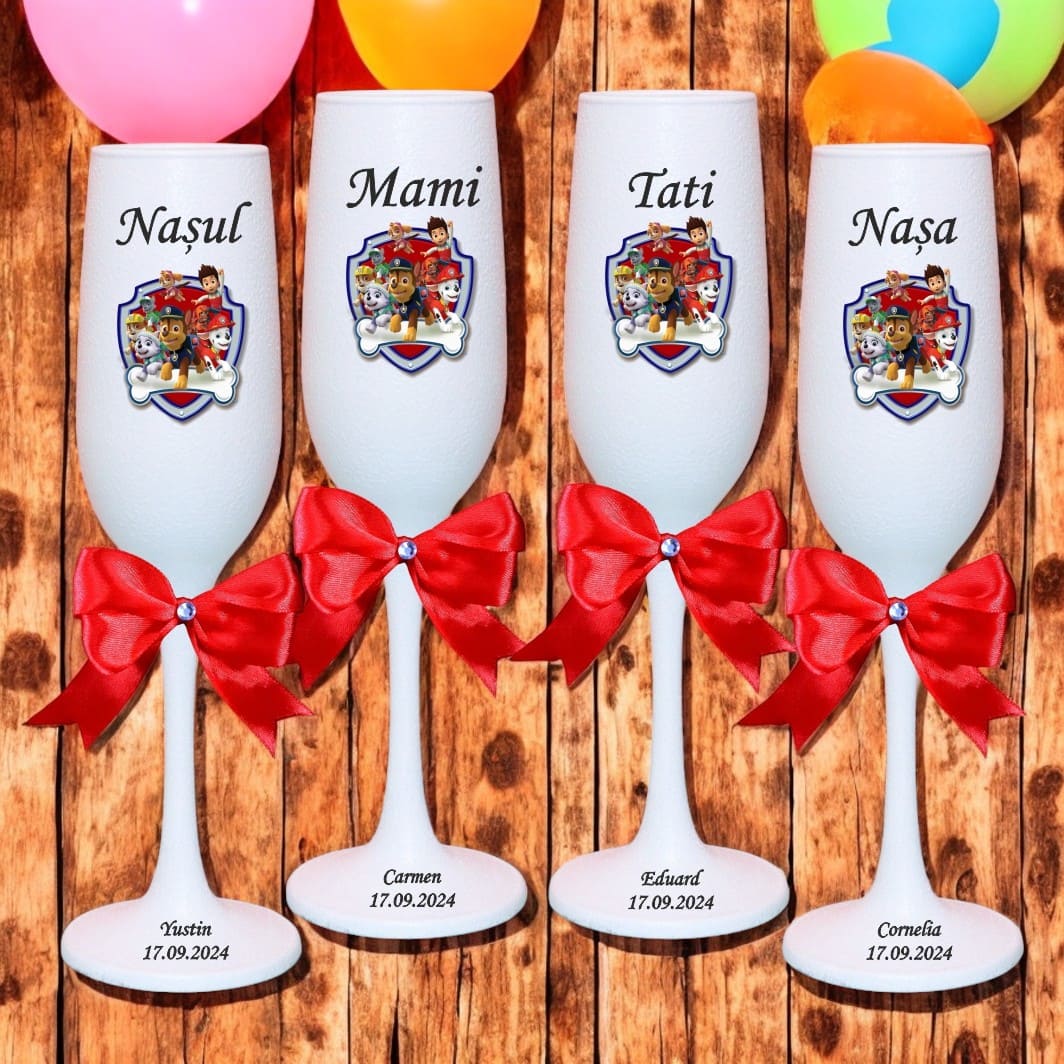 Setul de pahare botez personalizate cu Paw Patrol este o alegere inspirată pentru a celebra primul eveniment important din viața copilului. Paharele pot fi folosite atât în timpul petrecerii, cât și ulterior, ca amintire de suflet pentru familie și nași. Combinația dintre albul pur, fundița colorată și printul de poveste creează un ansamblu armonios, potrivit pentru tematici de botez elegante.