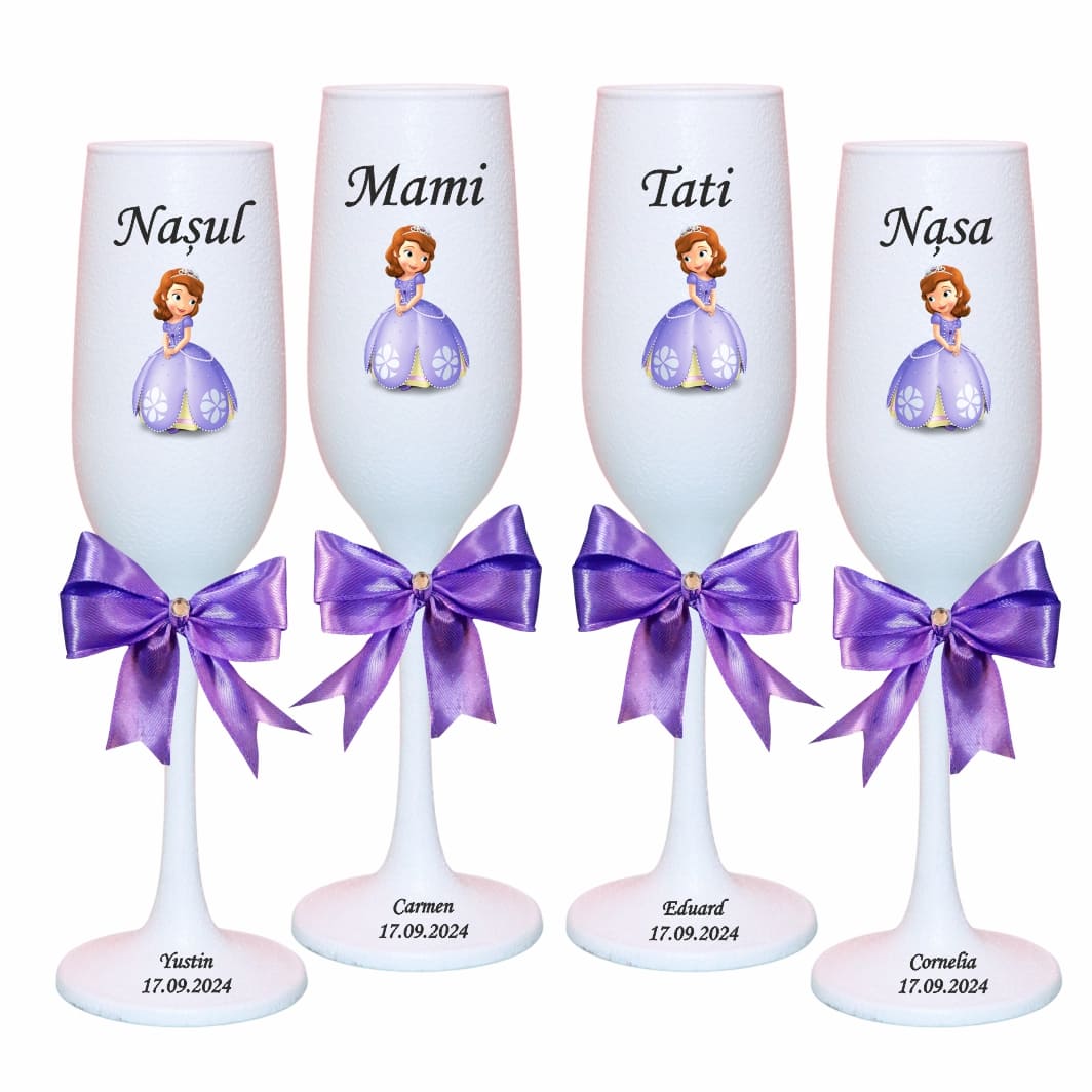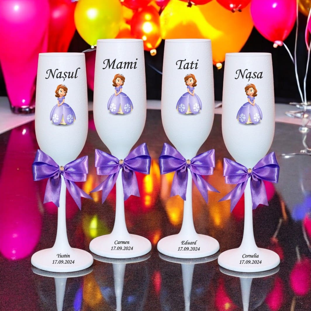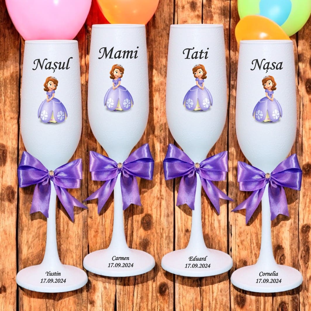 Setul de pahare botez personalizate cu Printesa Sofia este o alegere inspirată pentru a celebra primul eveniment important din viața copilului. Paharele pot fi folosite atât în timpul petrecerii, cât și ulterior, ca amintire de suflet pentru familie și nași. Combinația dintre albul pur, fundița colorată și printul de poveste creează un ansamblu armonios, potrivit pentru tematici de botez elegante.
