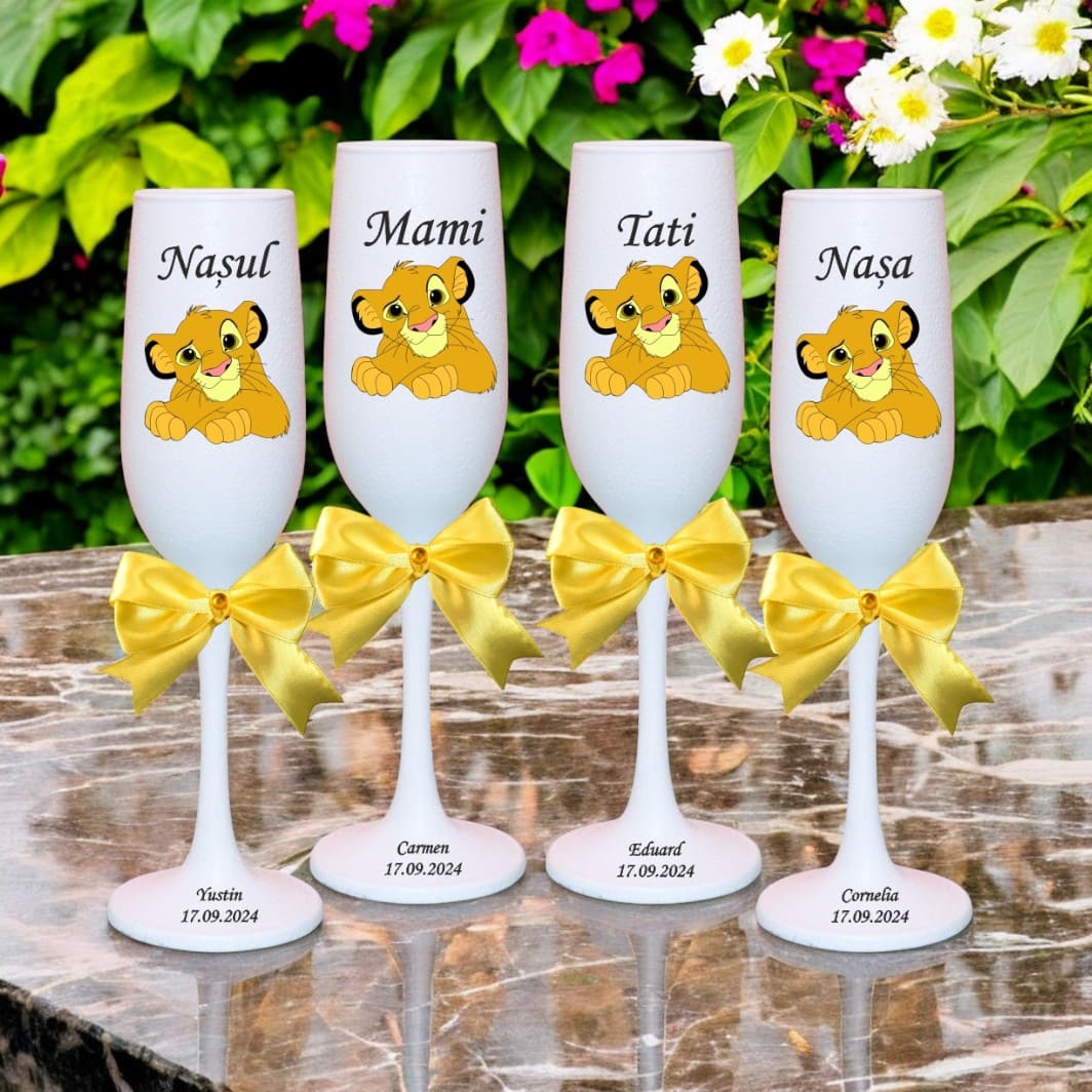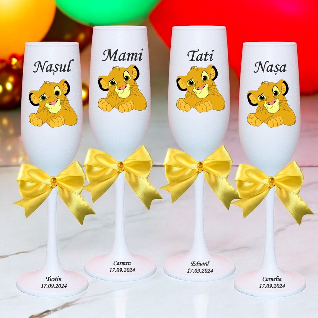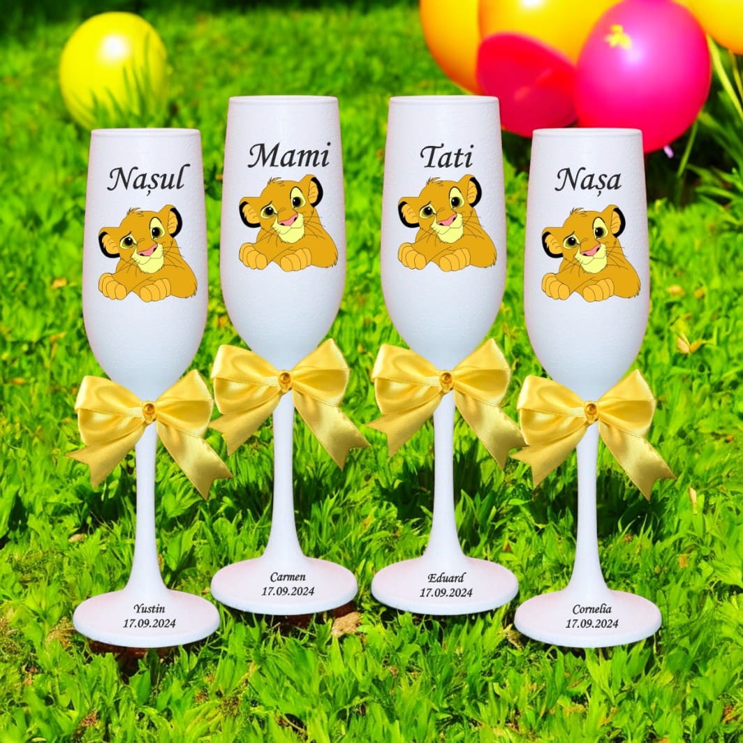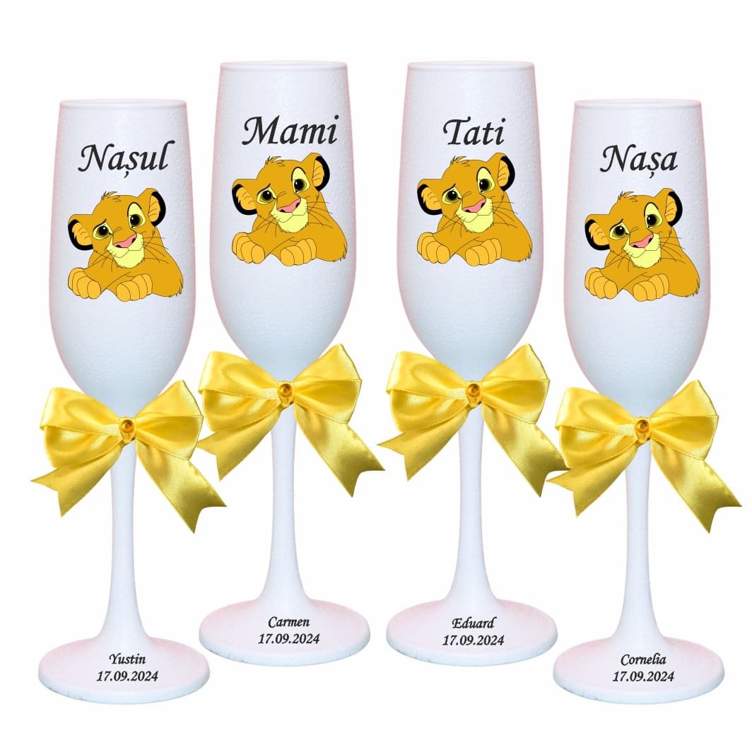 Acest set de pahare personalizate de botez este perfect pentru părinți, nași și invitați care își doresc un accesoriu elegant și tematic pentru masa de sărbătoare. Designul adorabil cu Simba adaugă un aer jucaus, transformând fiecare moment într-o amintire de neuitat. Fiecare pahar este finisat manual cu grijă, iar printul UV garantează o imagine clară, detaliată și permanentă.
